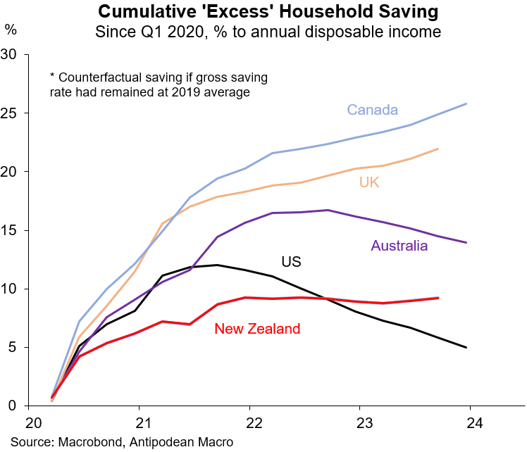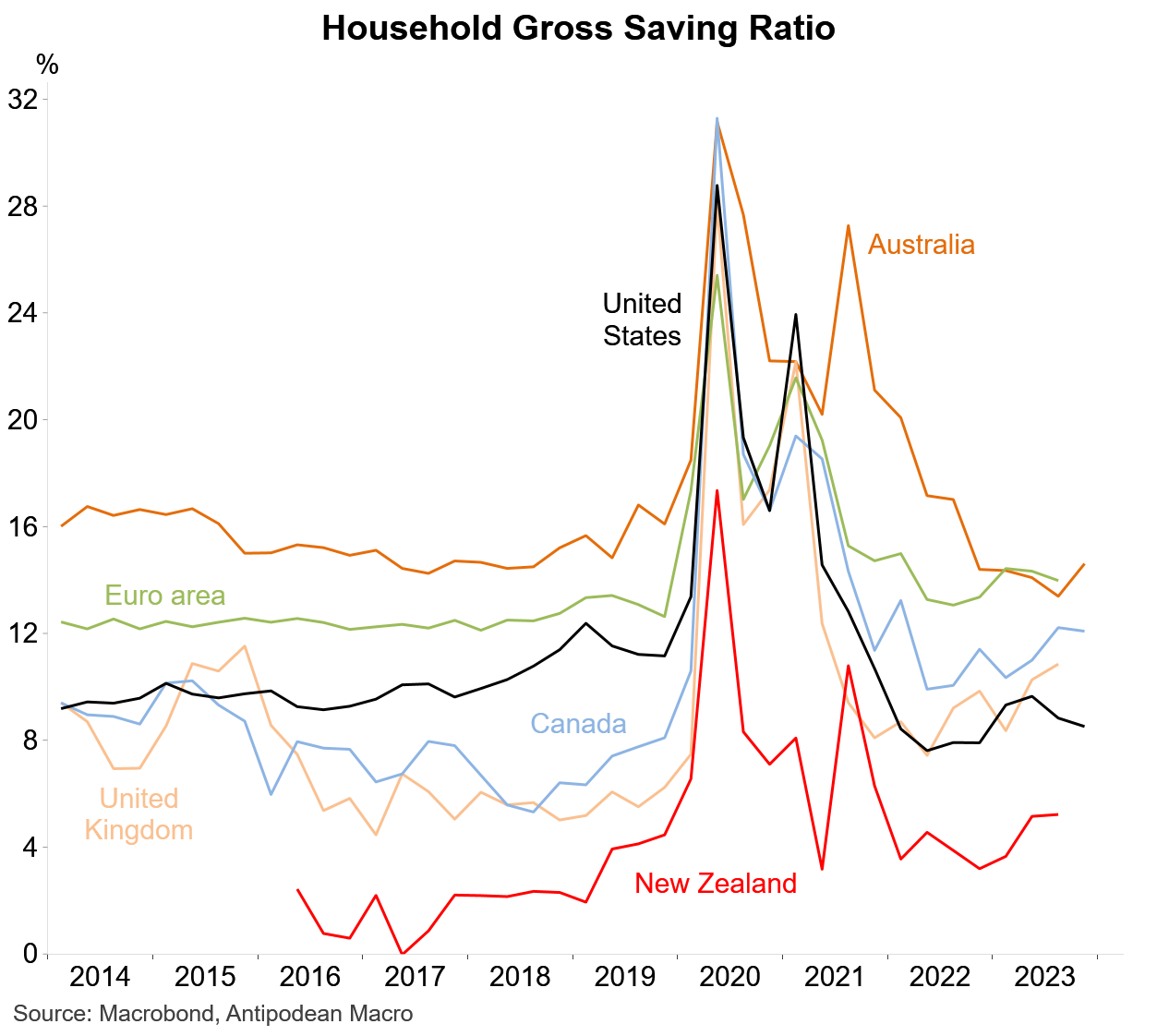 5. The net household saving ratio in Australia rose to 3.2% in Q4. Australia’s gross household saving ratio also increased, though the stock of ‘excess’ household saving since the pandemic declined a little as a share of disposable income.