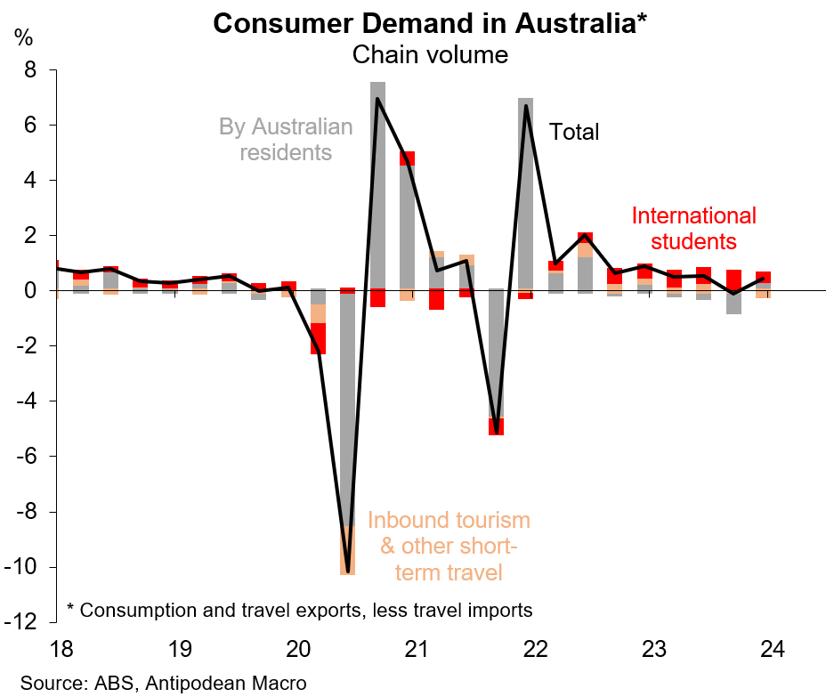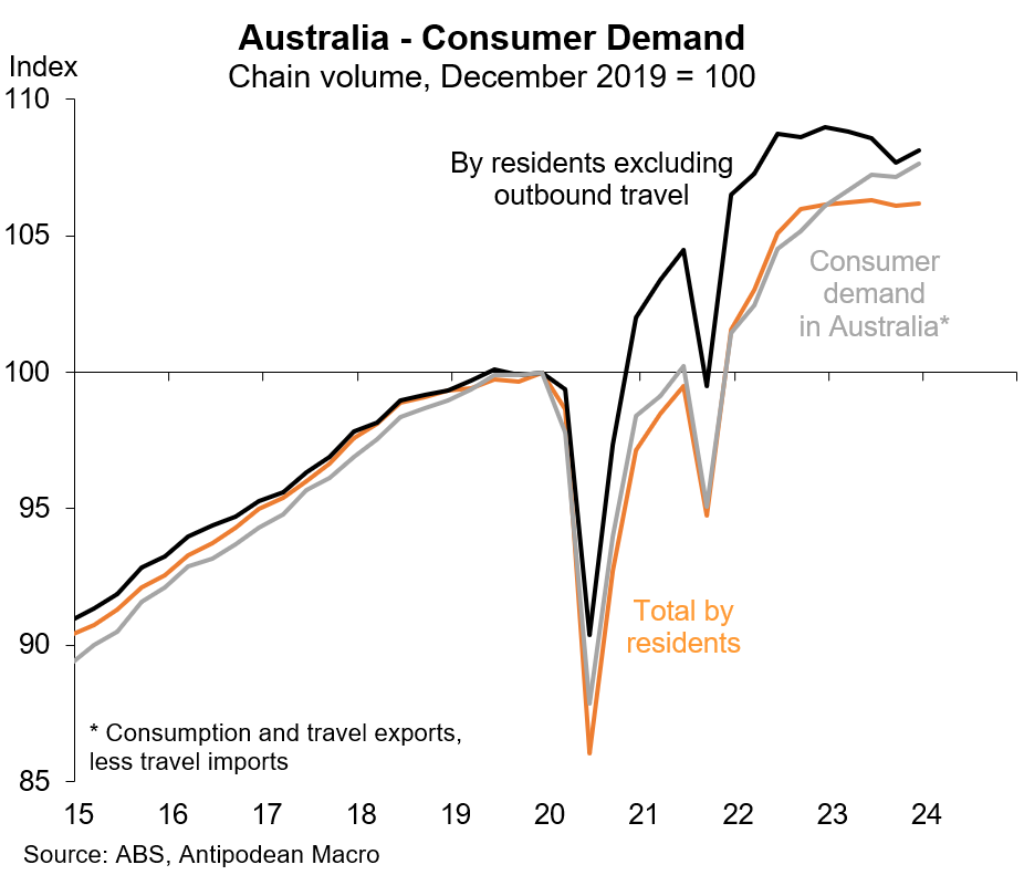Aggregate consumer demand in Australia - including net international travel spending - has looked a little healthier than just domestic consumption.
