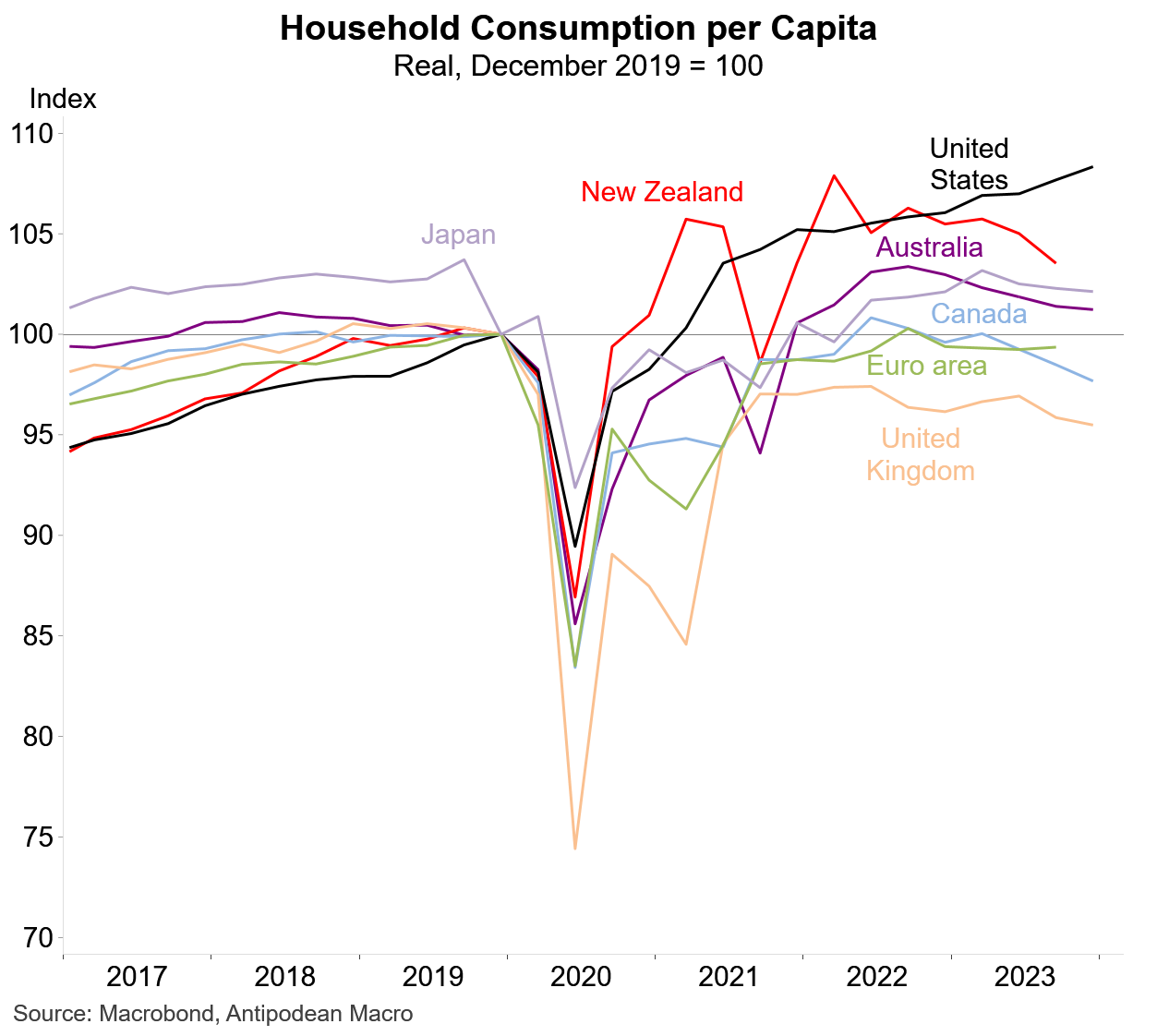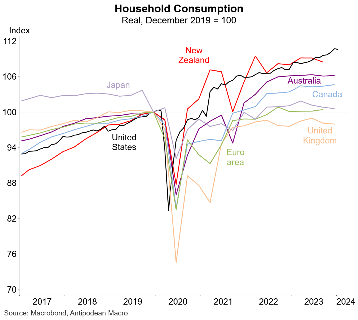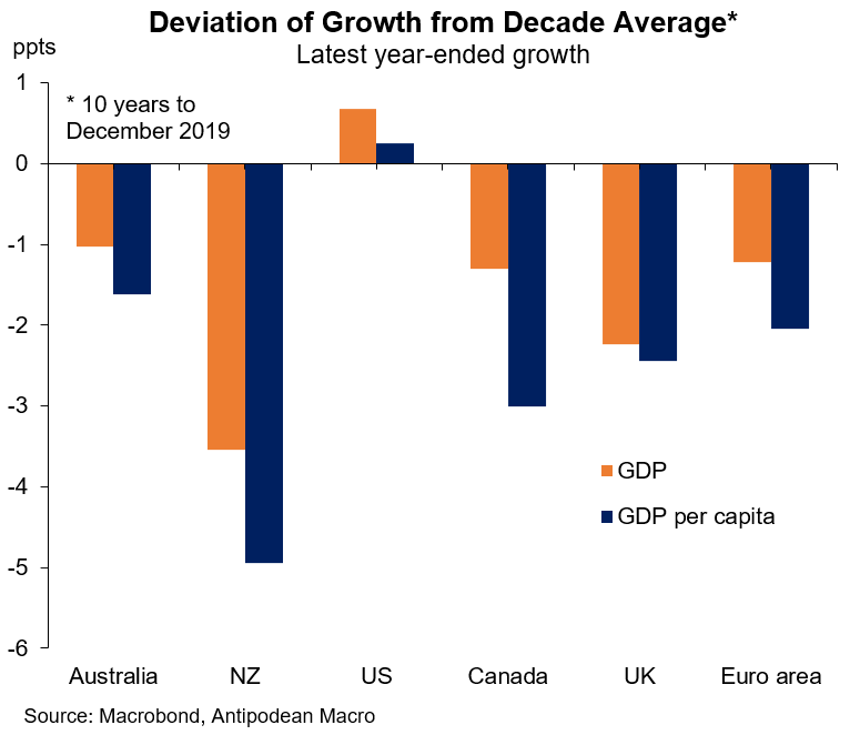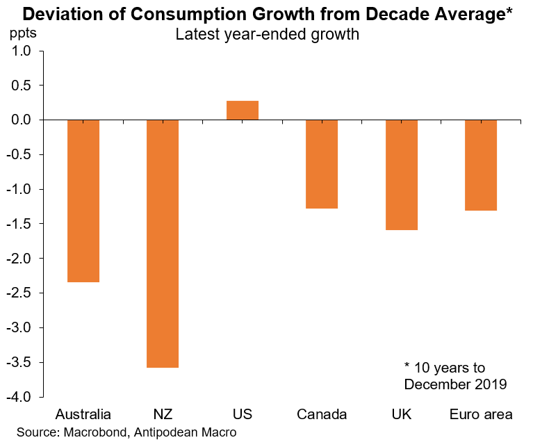 Consumption growth in Australia and New Zealand has been very weak relative to the decade average.