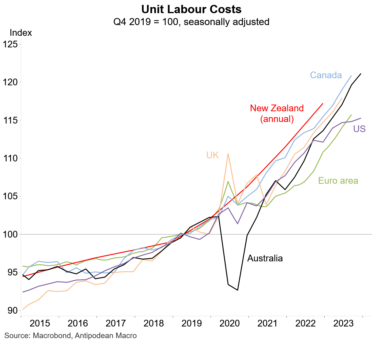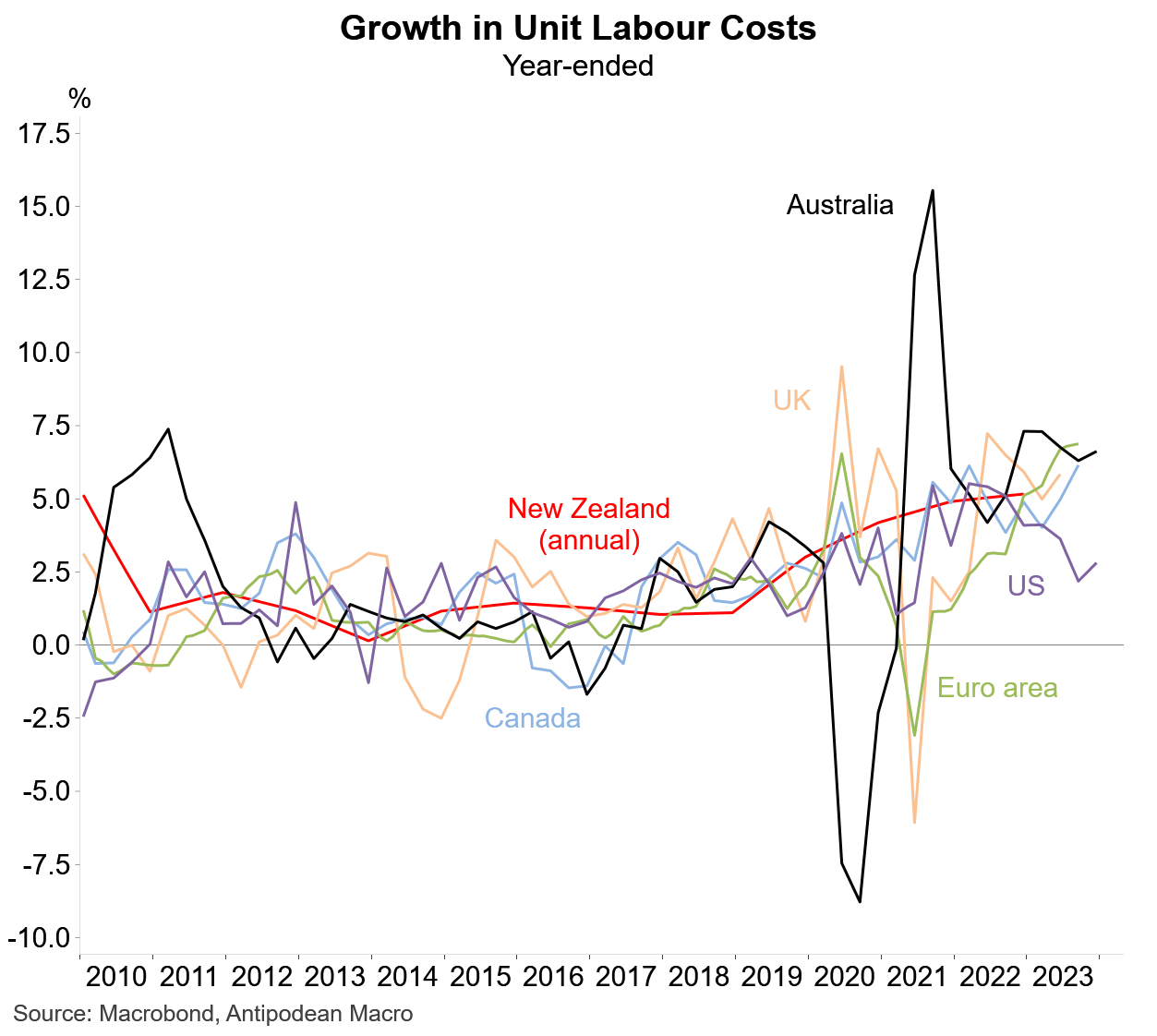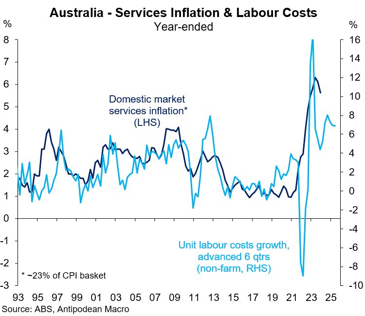 While there are some signs that elevated domestic services inflation is starting to cool a little in Australia, robust growth in unit labour costs (and lags) means that it is likely to take some time to fall substantially.
