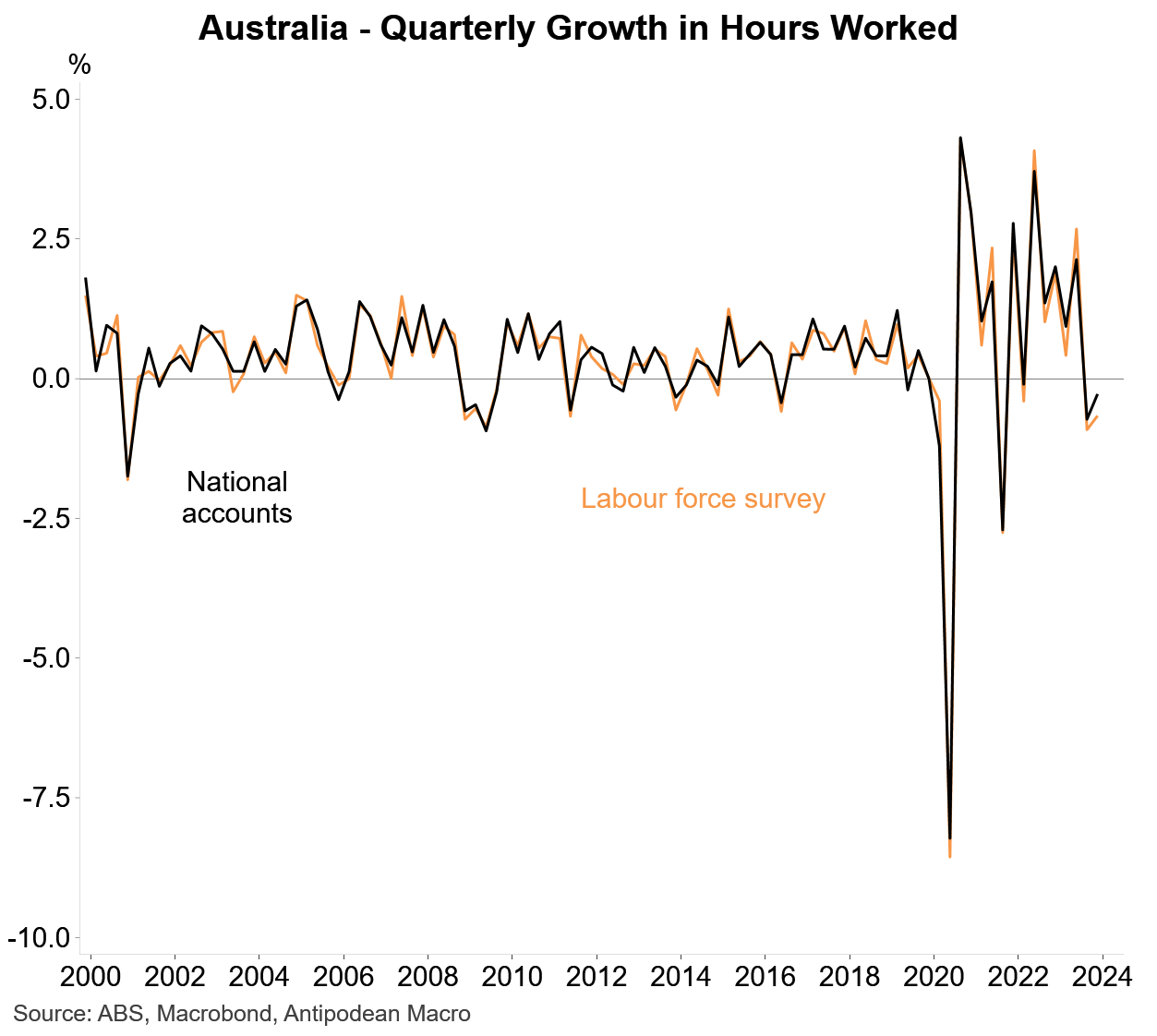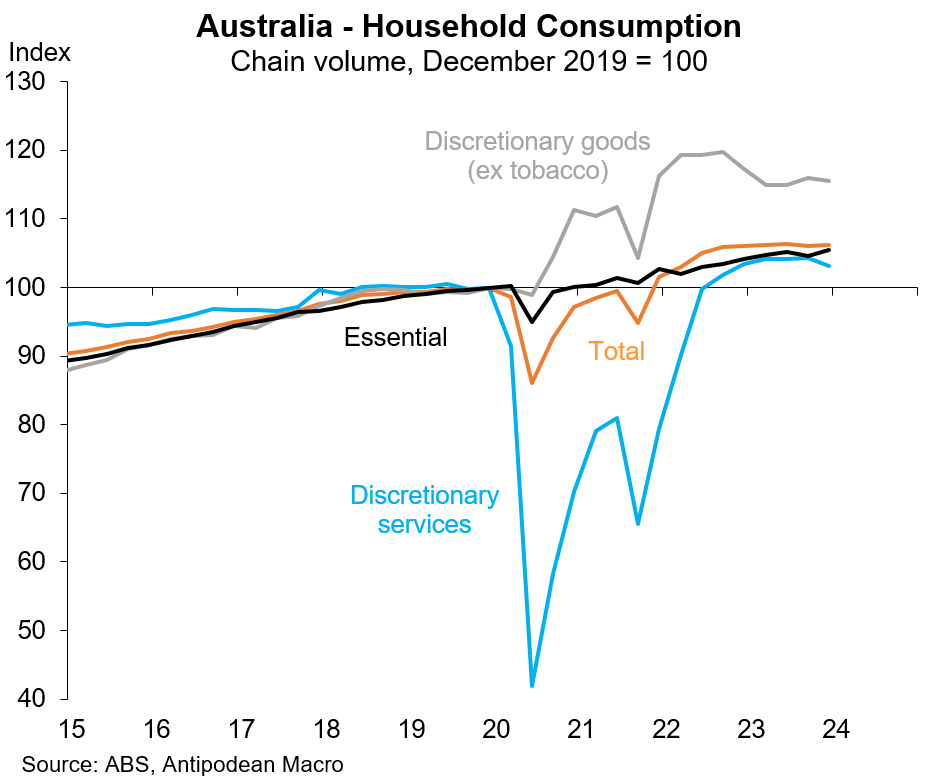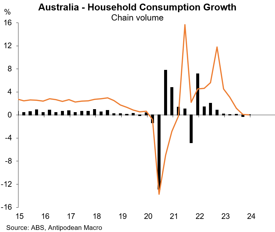 3. Household consumption in Australia rose just +0.1% in Q4 2023 and over the year. Real discretionary spending declined in the quarter.
