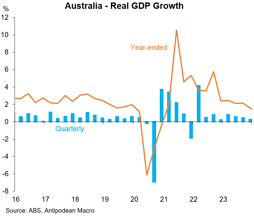 1. Australia’s GDP rose +0.24% q/q and 1.5% y/y in Q4 2023, which was in line with consensus and the RBA’s +1.5% y/y SoMP forecast.