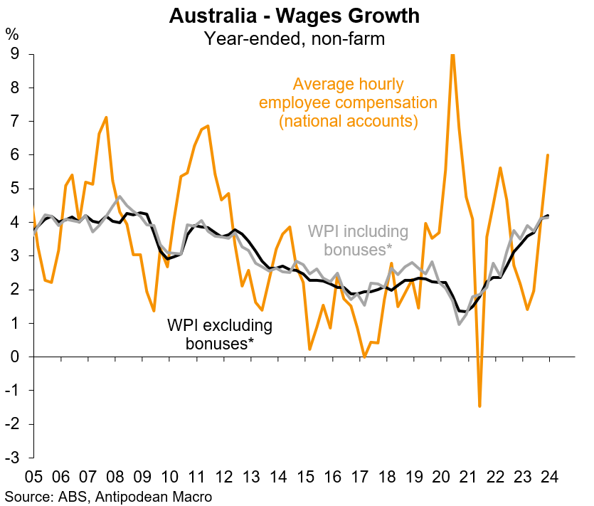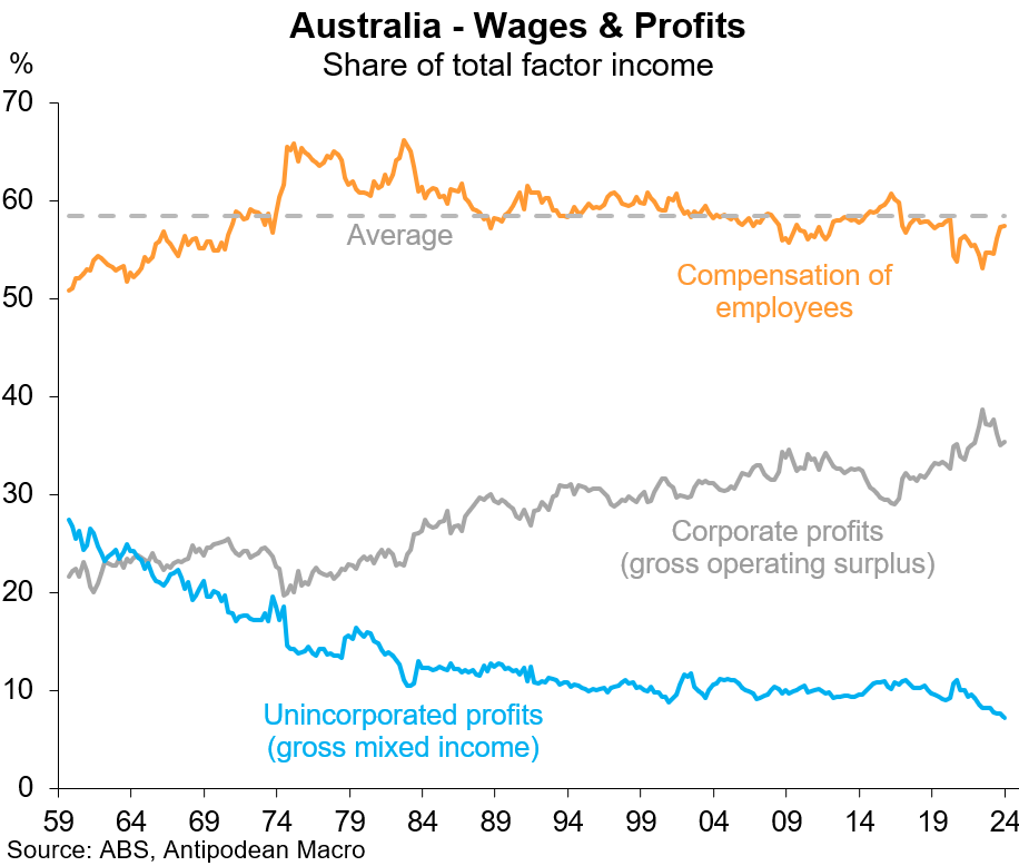 11. The wages share of income in Australia has risen for several quarters to be close to the long-run average.