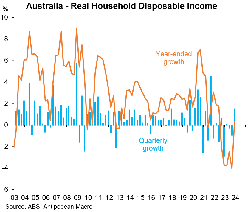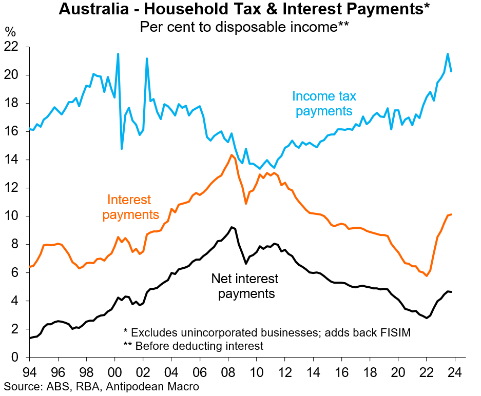 7. Household disposable income growth was supported in Q4 by lower income tax payments (as foreshadowed by monthly tax data) in Q4 2023 and net interest payments also ticked lower as a share of disposable income.