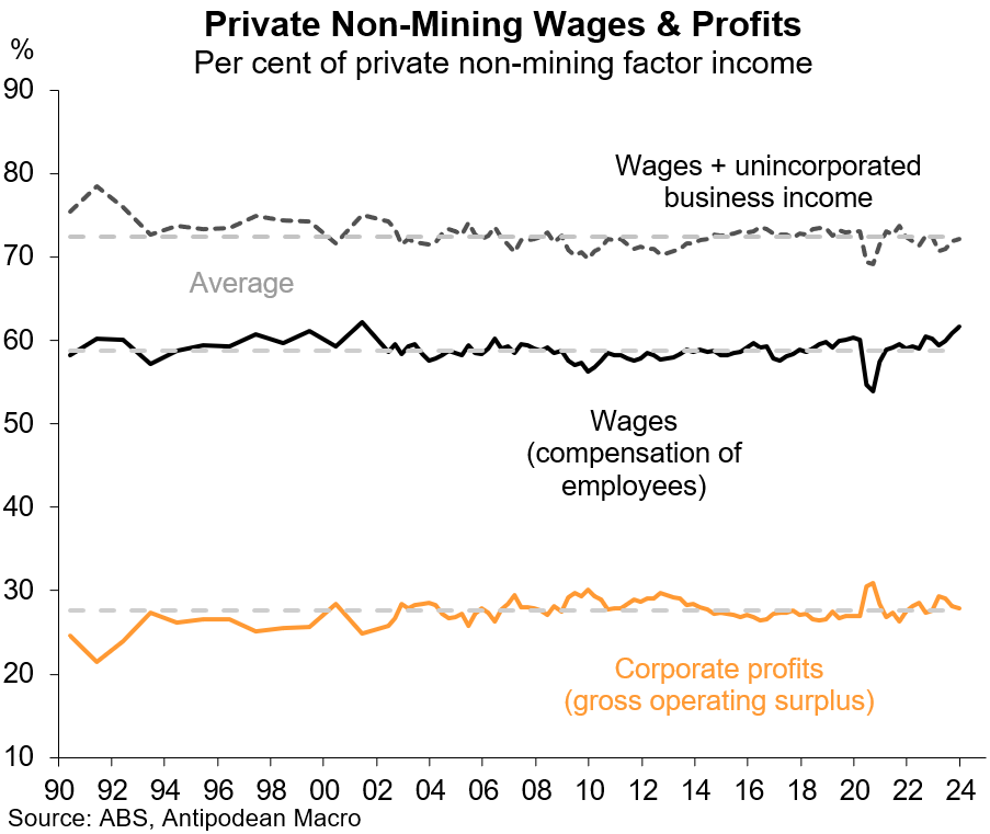Focusing just on the private non-mining sector, the wages share has risen strongly to be average the 30-year average.