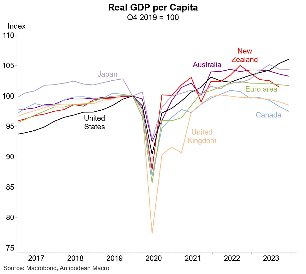 2. Real GDP per capita has fallen for 3 quarters in Australia but it’s not alone in exhibiting weakness.