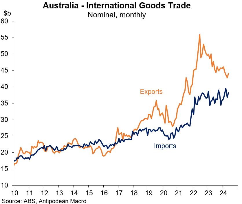 Nominal imports rose more quickly than exports in May and have fallen by less than exports in the first 2 months of the quarter. The quarter-to-date declines are likely to at least partly reflect lower prices because the A$ TWI rose nearly 2% in Q2.