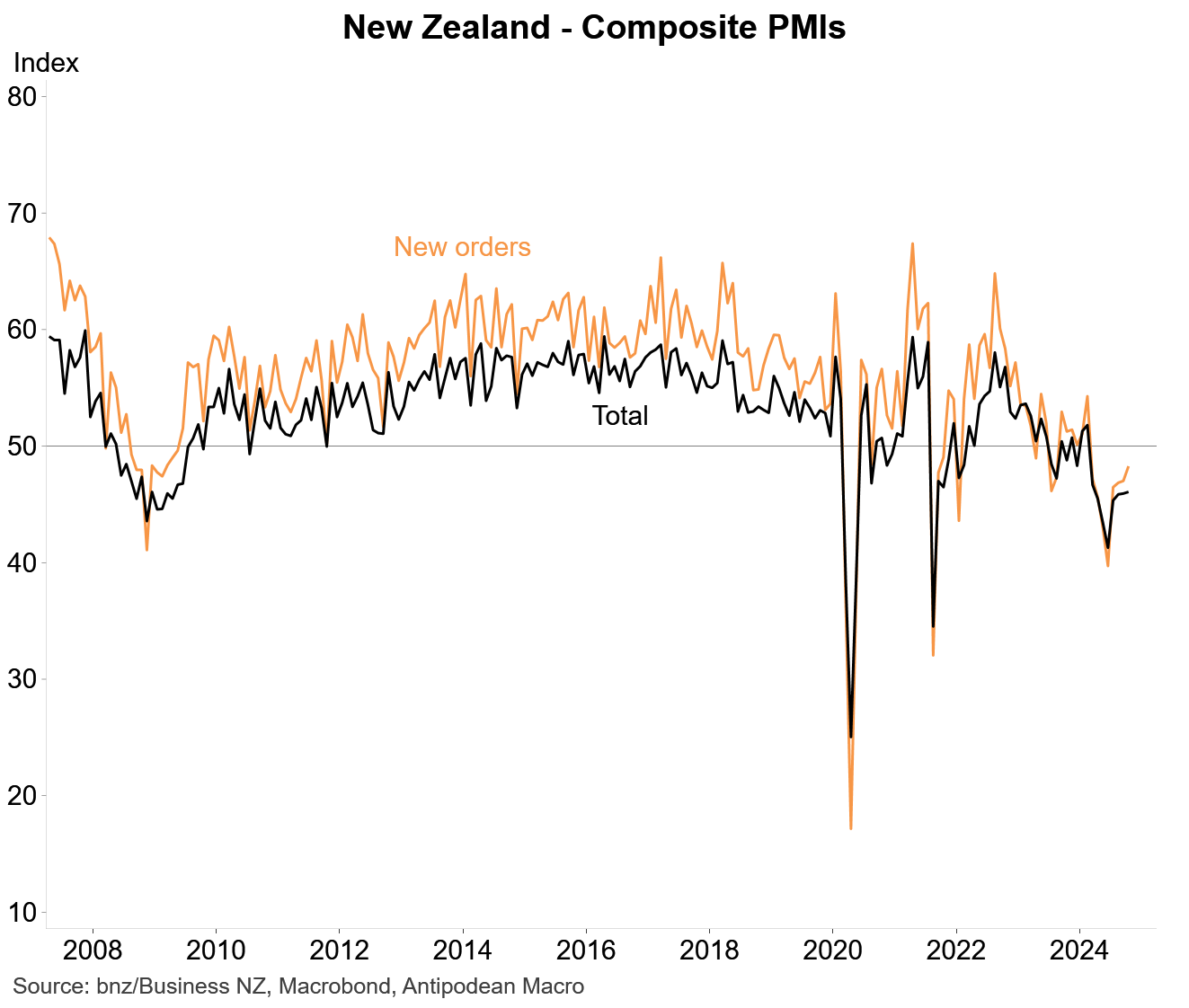 1. New Zealand’s composite PMI - the PCI - rose slightly in October to a still-weak 46.1. The new orders component was more positive, rising to 48.3.