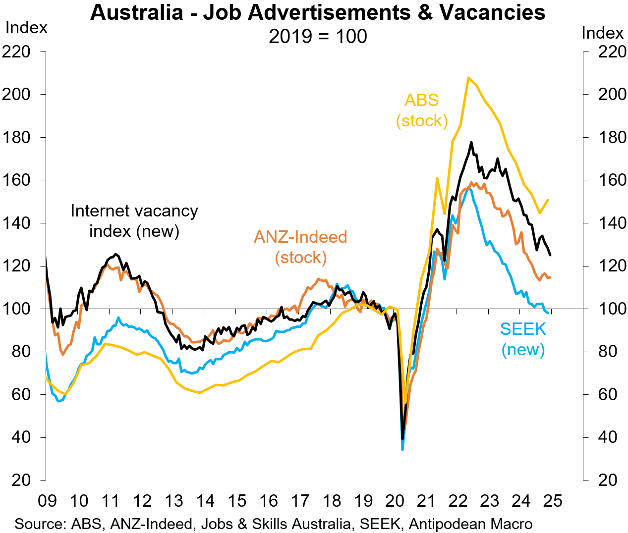 2. Measures of Australia’s job vacancy rate, however, have flattened out or fallen in recent months, consistent with some stalling in labour market deterioration, at least for now.