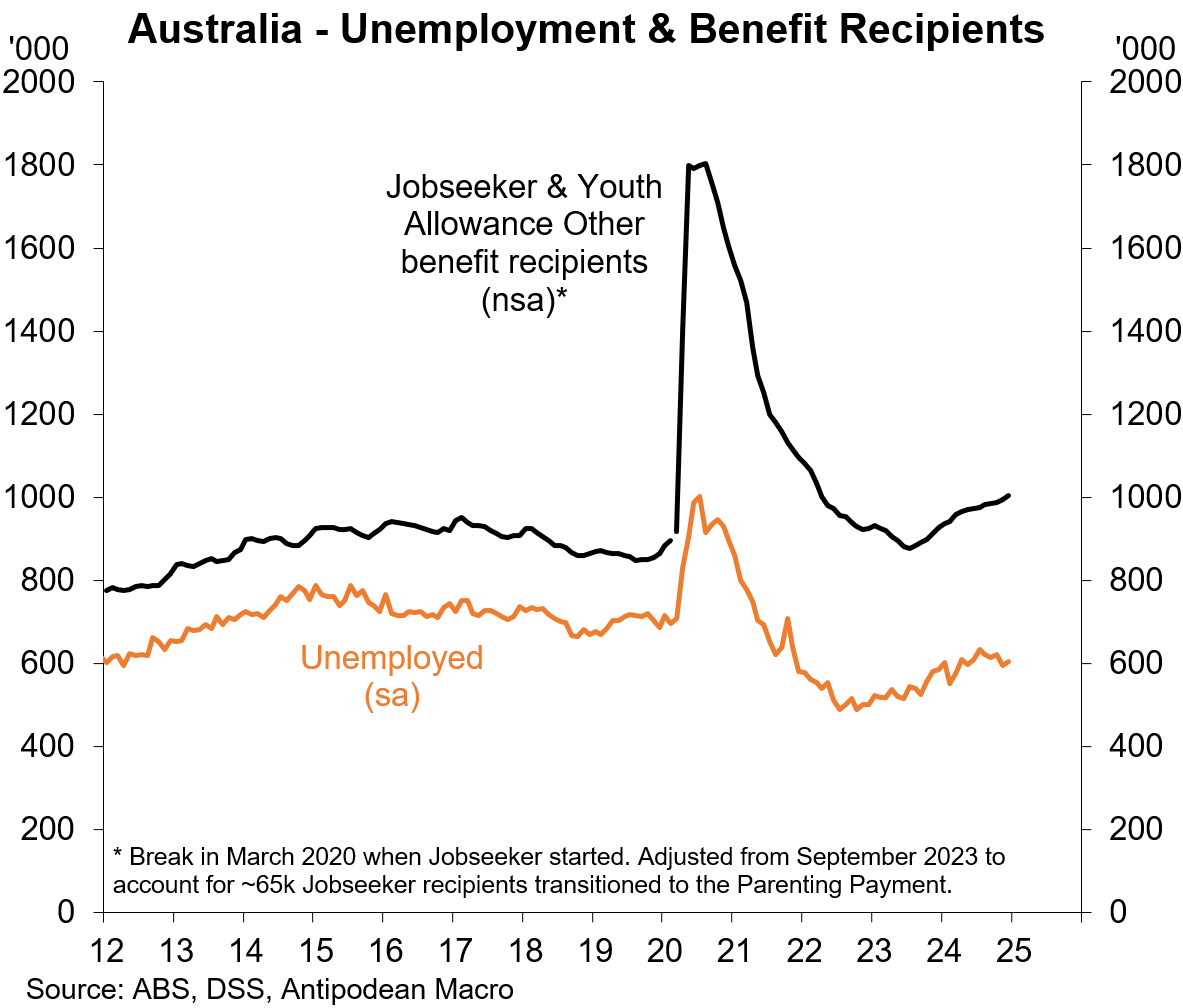 1. The number of Jobseeker benefit recipients in Australia rose solidly in December (there is typically a lag between changes in the ABS unemployment figures and benefit recipient numbers).