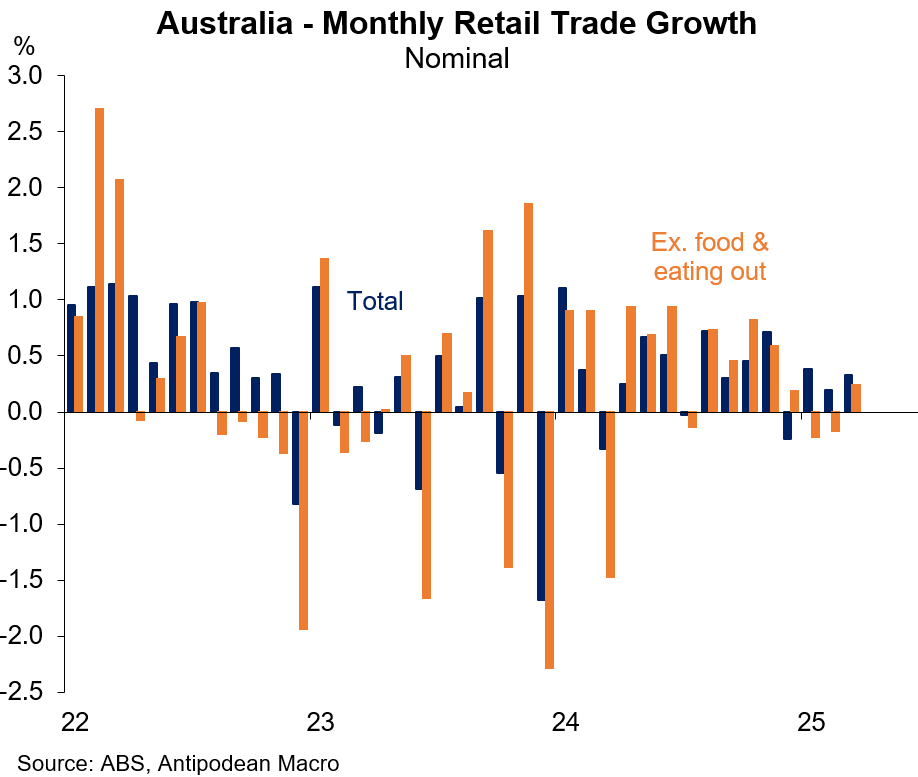Retail sales fell 0.4% m/m in Queensland as non-food sales (-1.8% m/m) were adversely affected by bad weather. Excluding Queensland, retail sales rose +0.5% m/m in March in the rest of Australia.