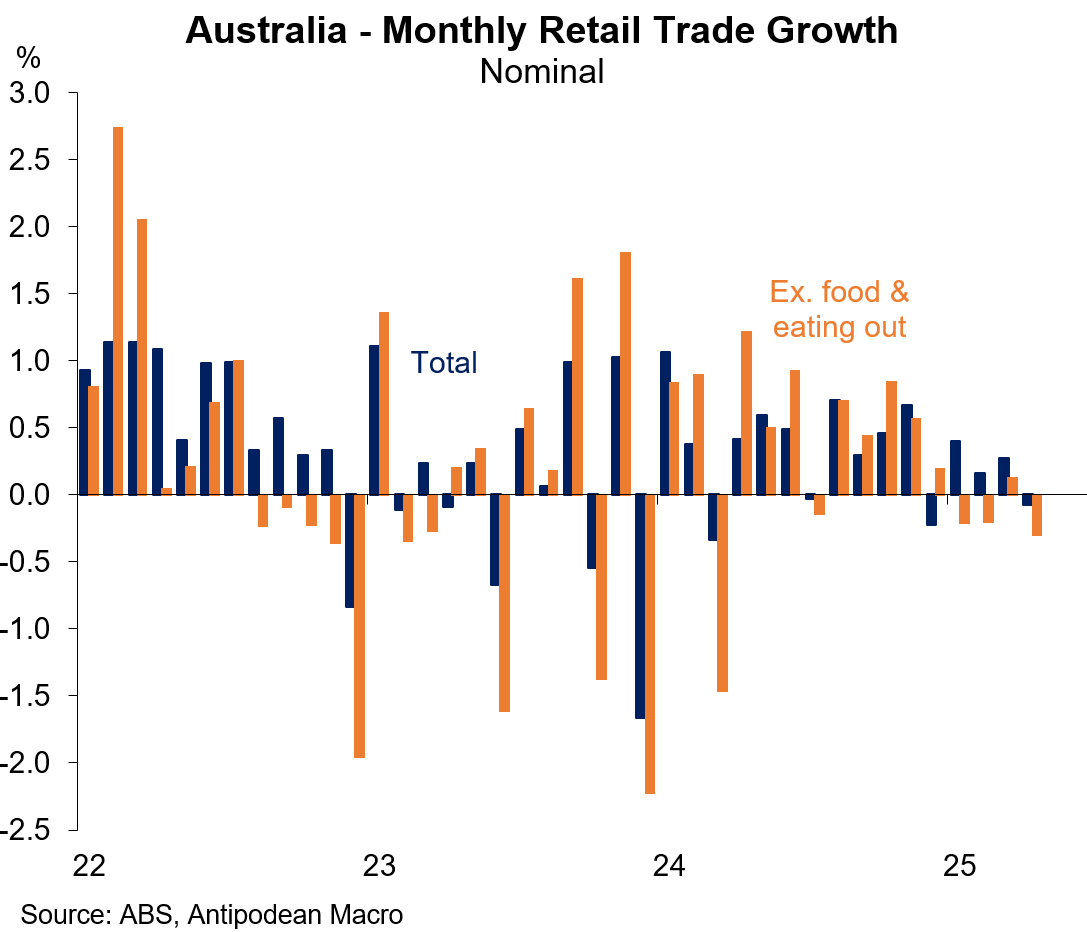 1. Retail trade in Australia fell 0.1% m/m in nominal terms in April but rose 3.8% y/y.