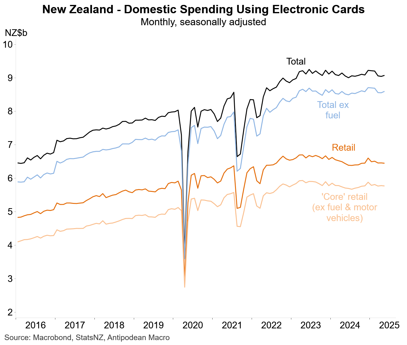 1. Domestic spending using debit and credit cards in New Zealand rose +0.3% m/m in nominal terms in May, but declined 0.2% m/m for retail spending.