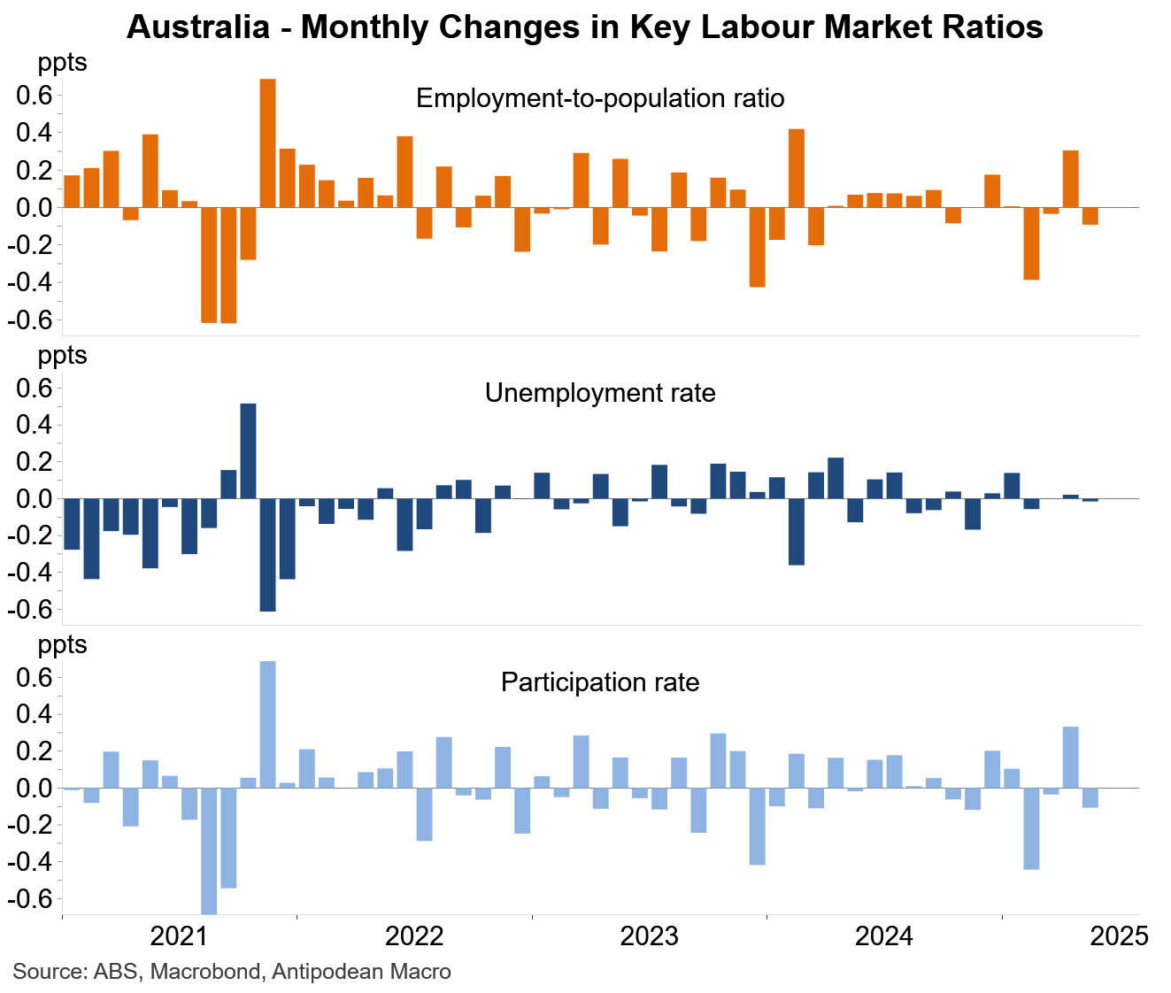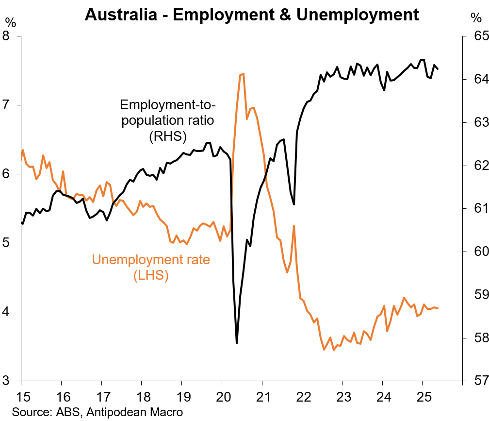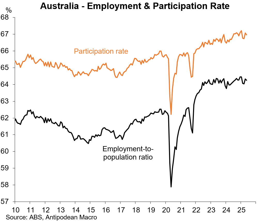 1. Measured employment in Australia declined 2.5k m/m in May, resulting in a small tick lower in the employment-to-population ratio to 64.25% alongside a similar fall in the participation rate to 67.0%.