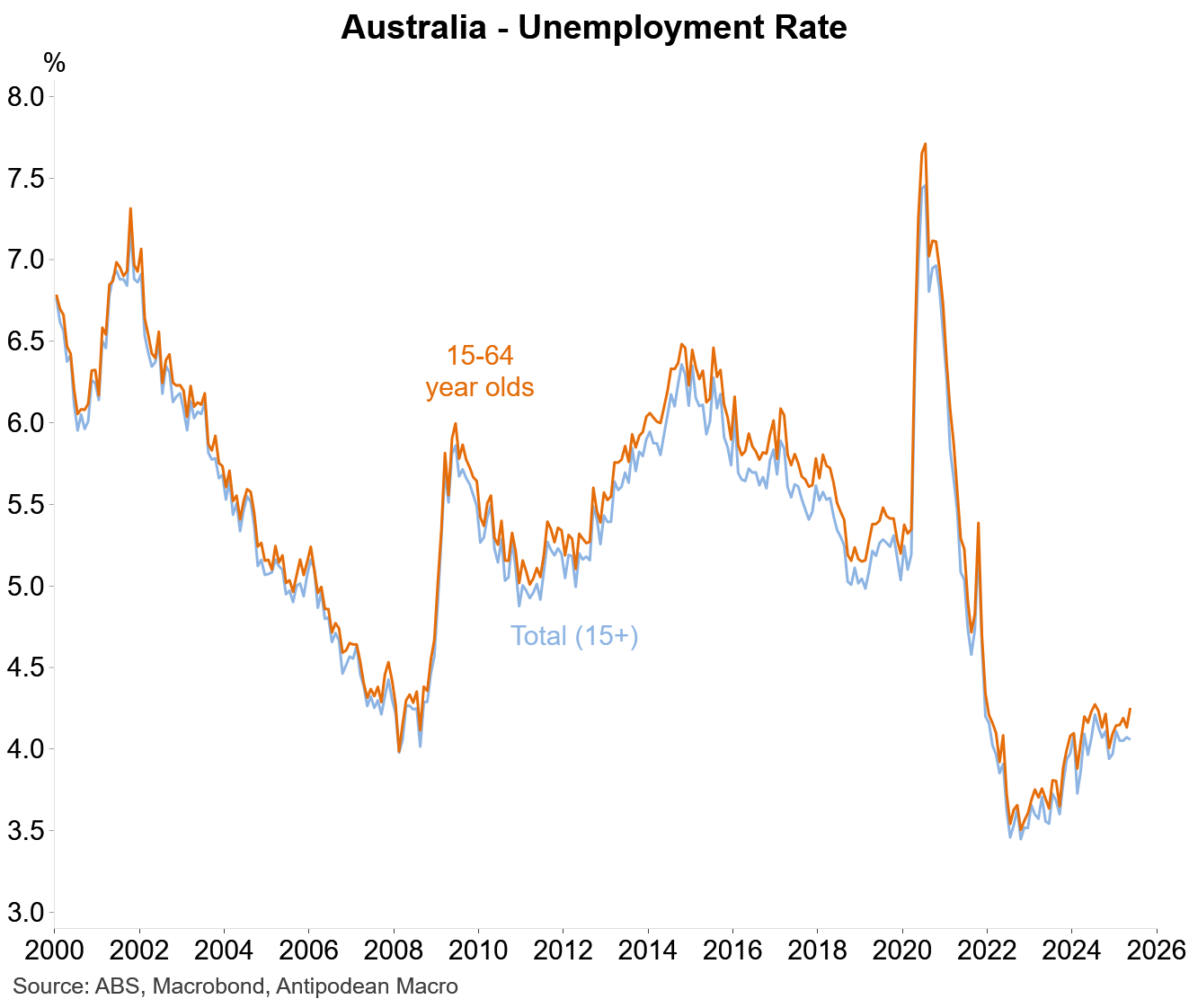 In contrast to the broadly flat aggregate unemployment rate, the jobless rate for 15-64 year olds in Australia has recently picked up.