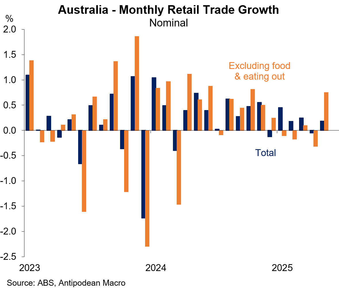 1. Retail sales in Australia rose just +0.2% m/m in nominal terms in May and increased +3.3% over the year.