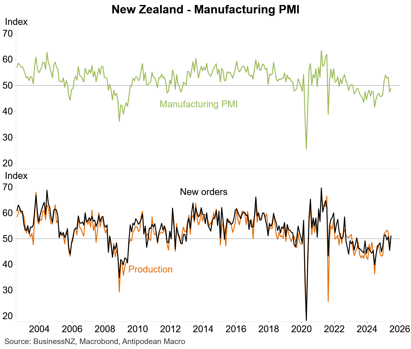 1. New Zealand’s manufacturing PMI improved only marginally to 48.8 in June. Encouragingly, however, the new orders component bounced back to 51.2.