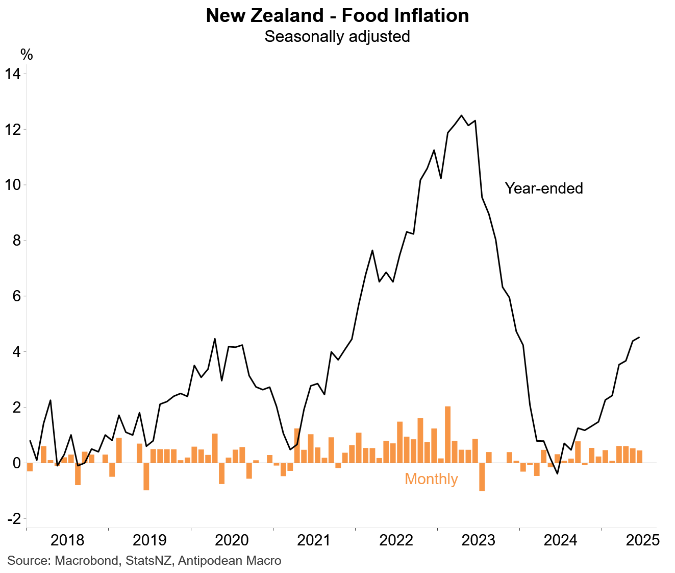 2. Kiwi food prices rose a strong +1.6% q/q in Q2 in both original and seasonally adjusted terms according to the monthly indicator.