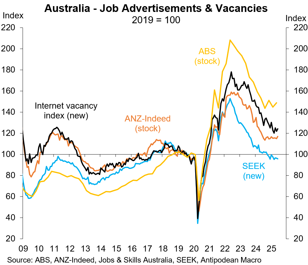 The number of new job ads on SEEK fell 0.7% m/m in June but has been little changed in recent months. The job vacancy rate rose further in the month.