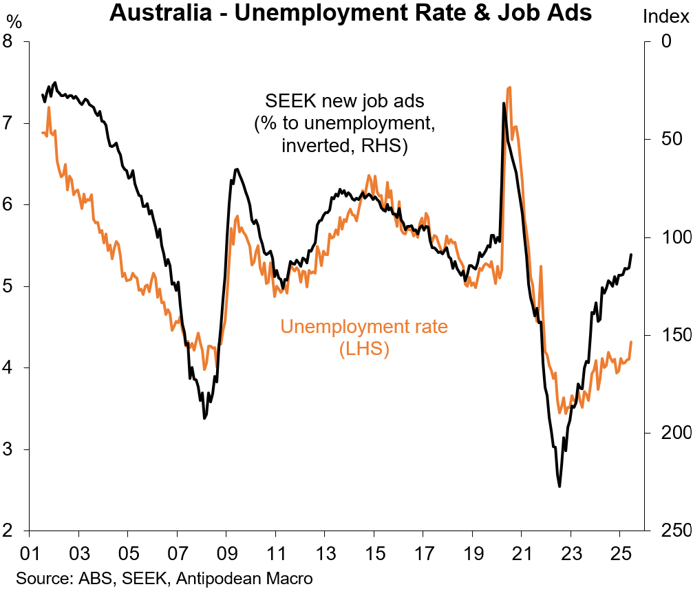 2. The ratio of SEEK job applications to job ads continued to rise in May and is at a very high level. We don’t read much into the extreme level of this series given anecdotal evidence that AI has supported a sharp rise in job applications.