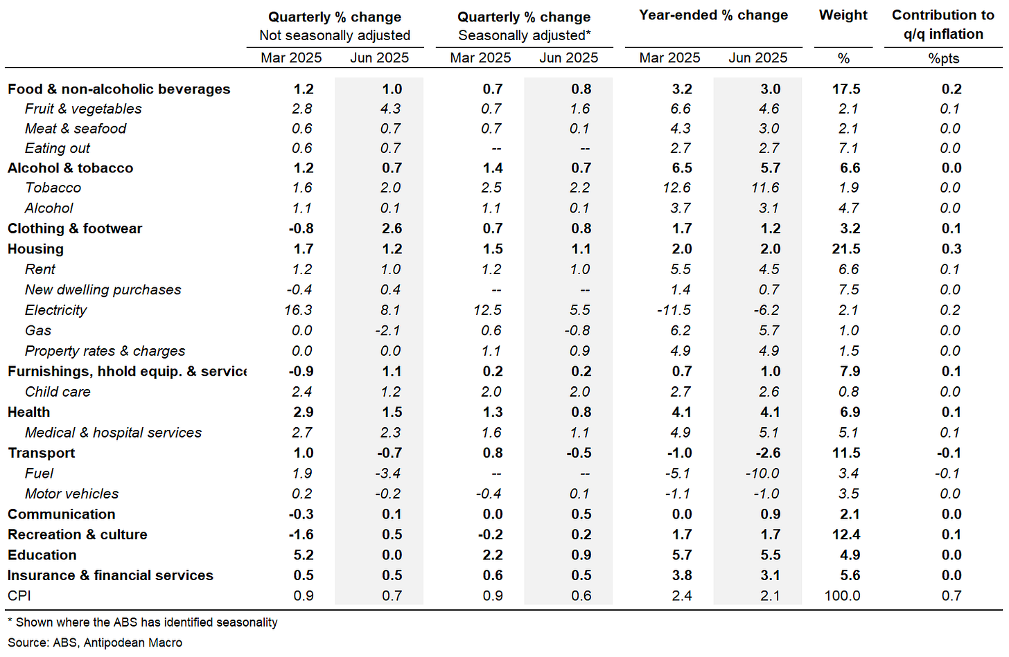 1. Australia’s Q2 headline CPI inflation of +0.7% q/q and +2.1% y/y was 0.1ppts below our/consensus expectations (+0.8% q/q, +2.2% y/y).