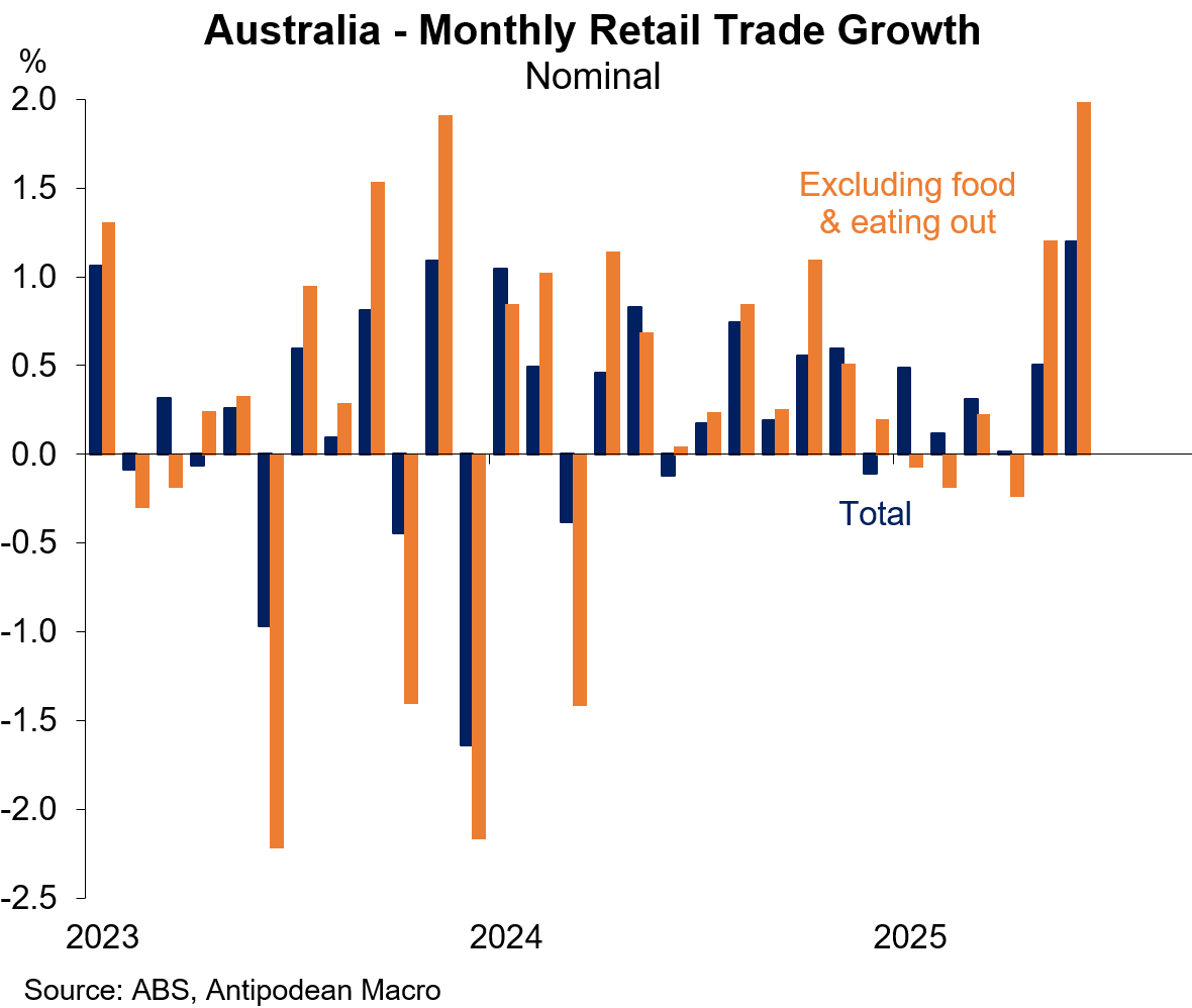1. Australia’s nominal retail trade jumped +1.2% m/m in June. Excluding food & eating out, sales rose a strong 2% m/m following growth of +1.2% m/m in May.