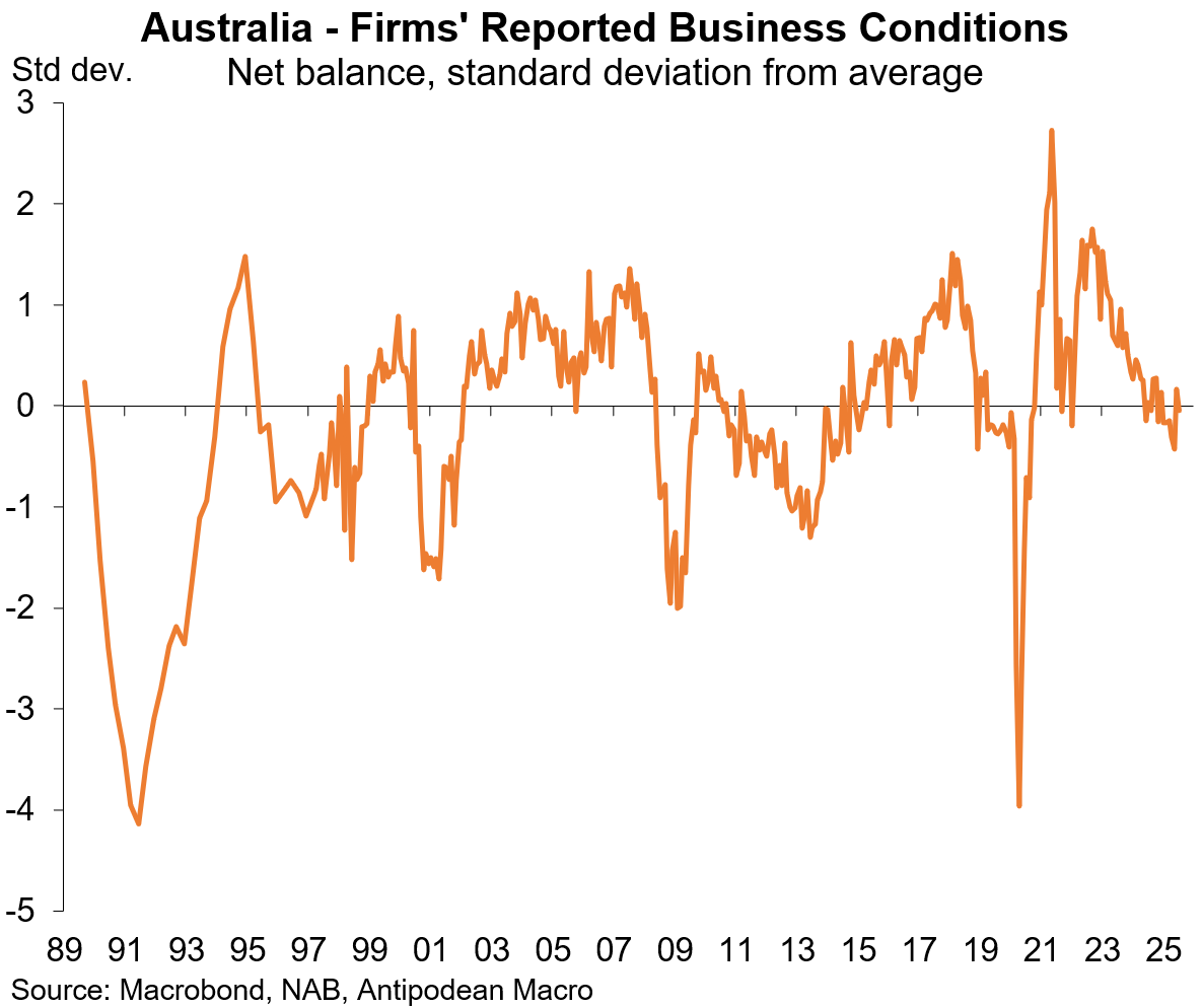 1. Australian firms reported a dip in business conditions in July but this only partly retraced the sharp improvement in June. Business conditions were around average levels.