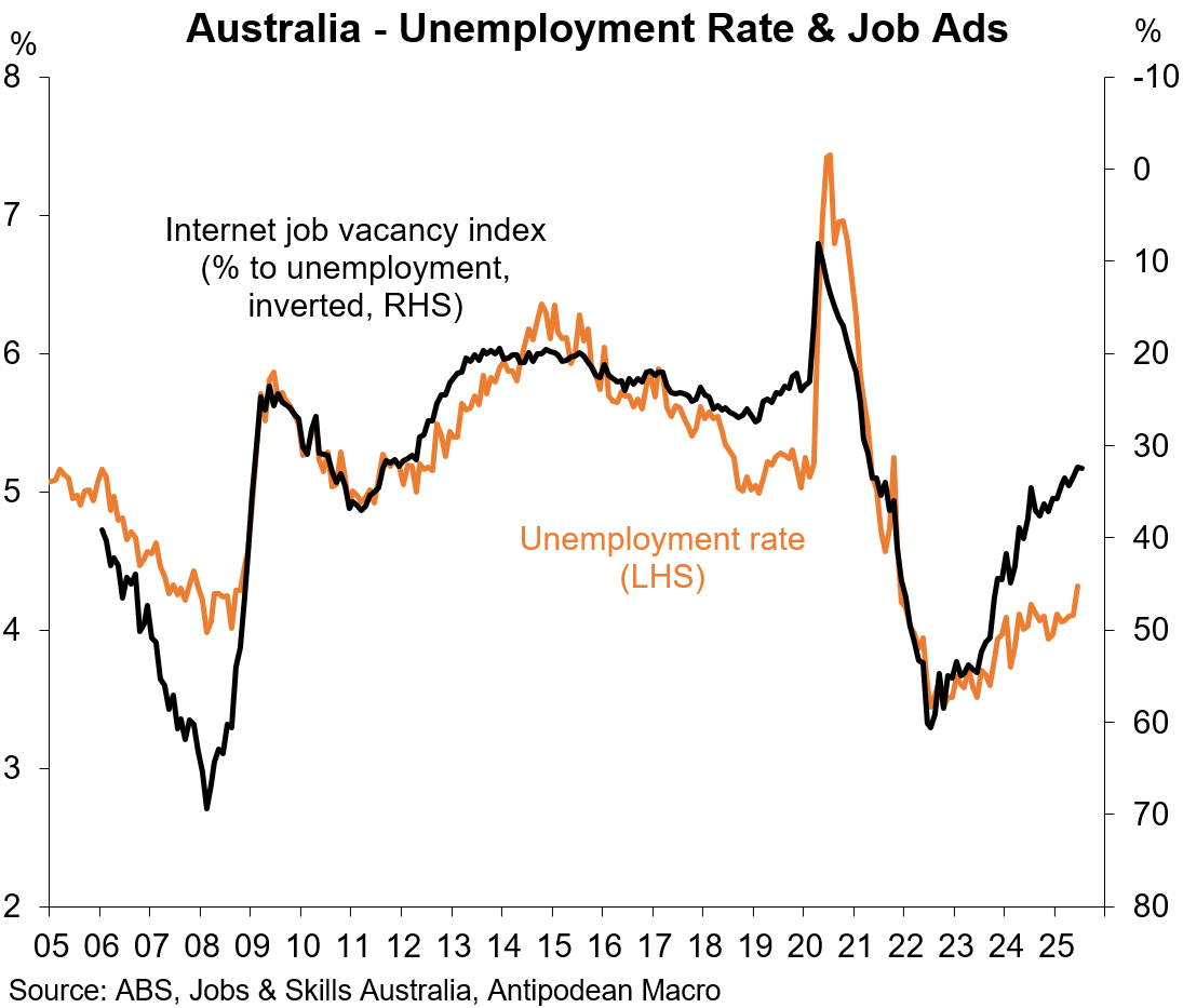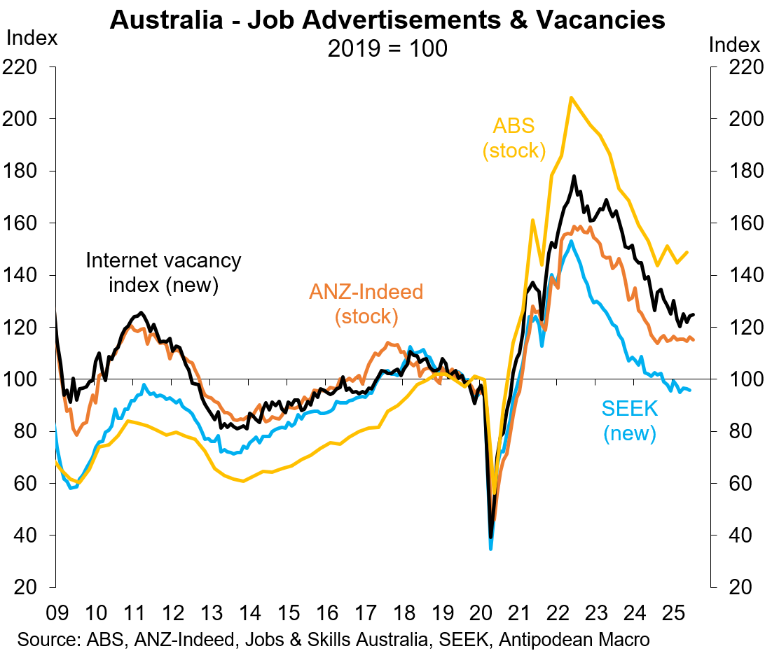 1. The number of new online job ads in Australia rose +0.3% m/m in July (black line) and has stabilised in recent months.