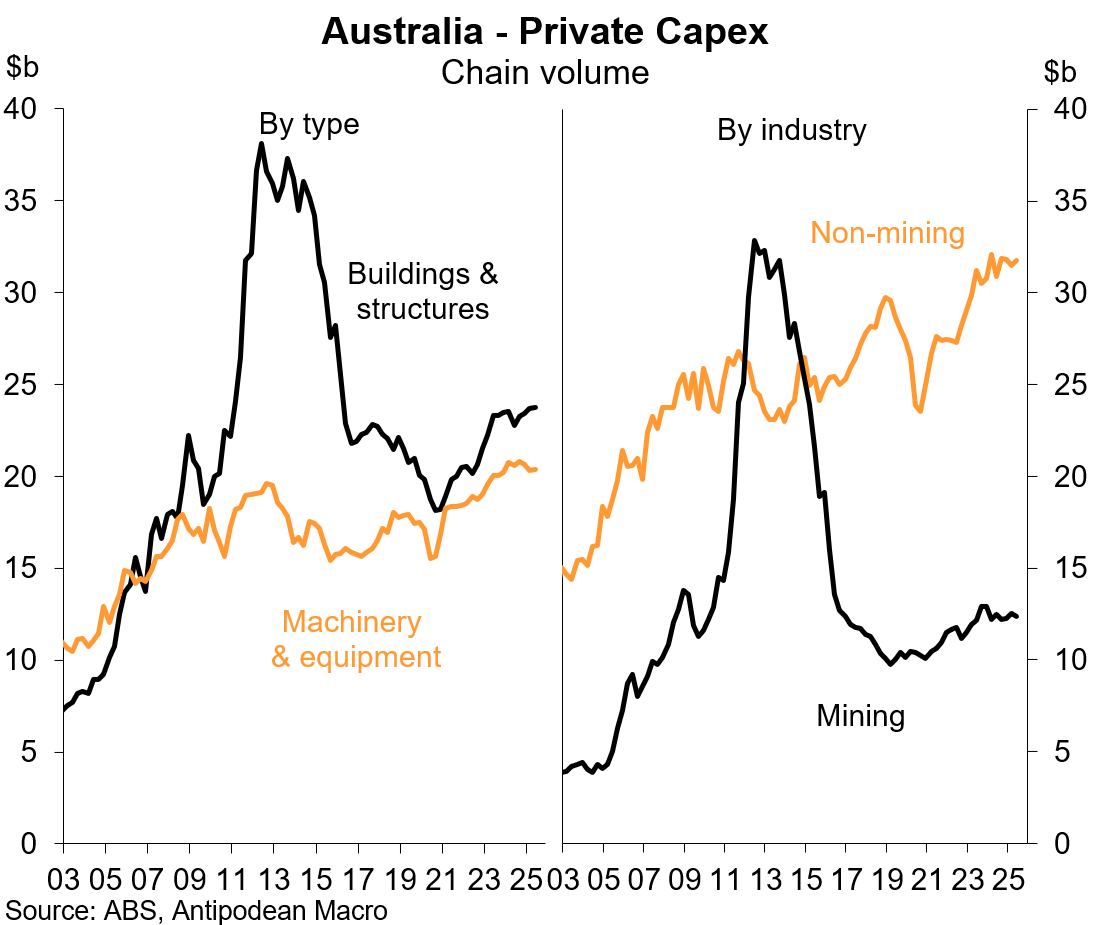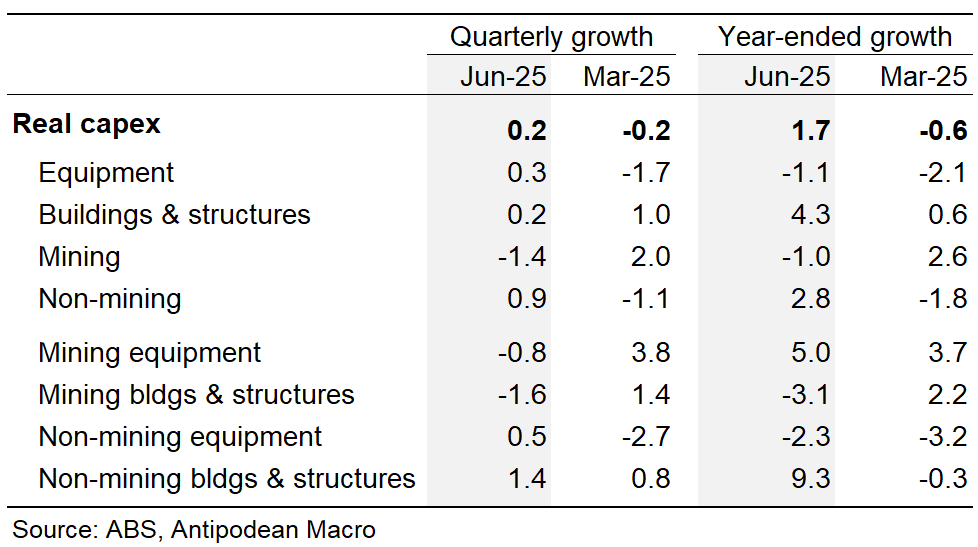 1. Real private capex in Australia rose just +0.2% q/q in Q2, with +0.9% q/q growth in non-mining capex offsetting a 1.4% q/q decline in mining capex.