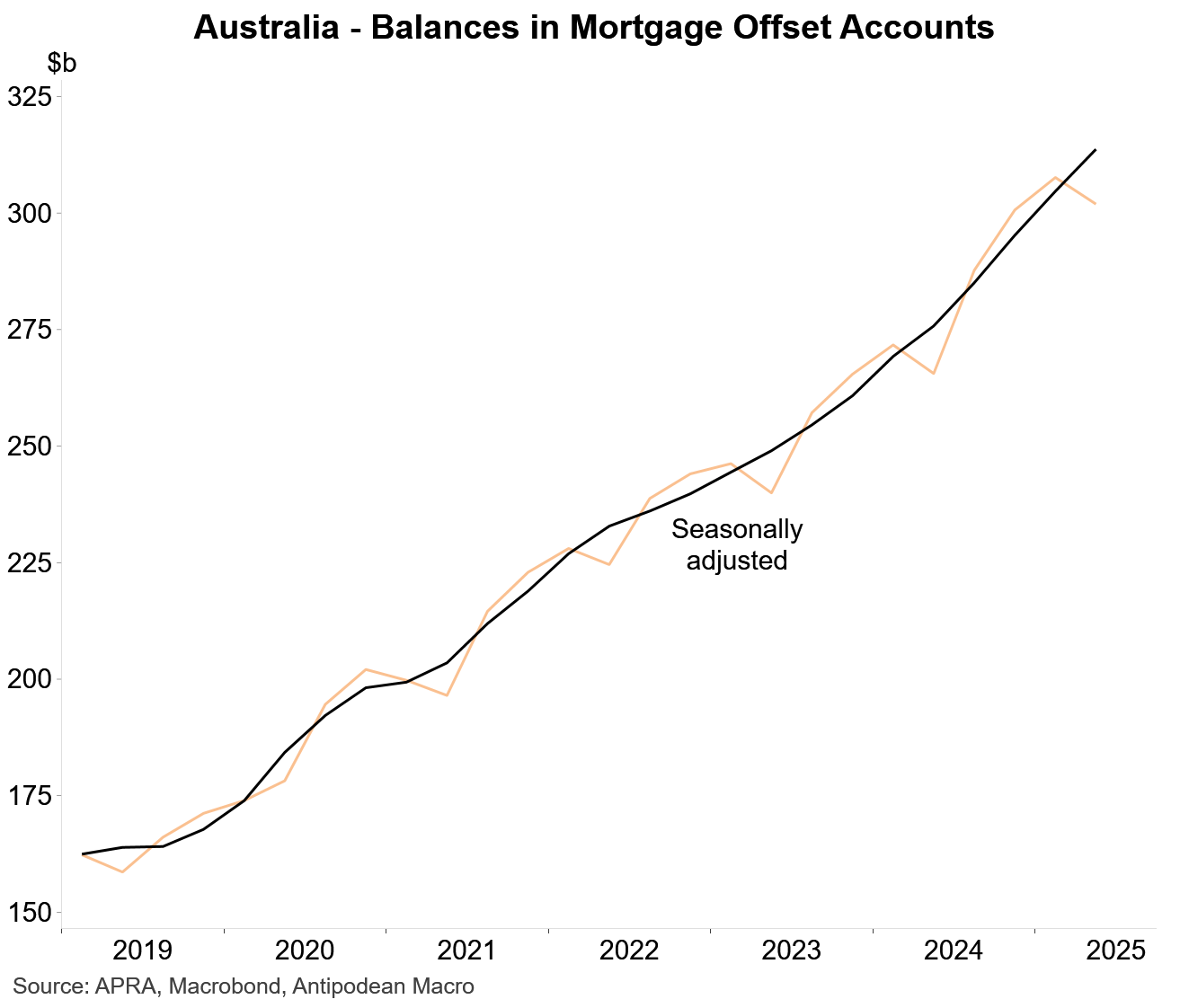 1. Balances in Australian mortgage offset accounts - deposit accounts offset against a housing loan for the purposes of calculating interest payments - reached nearly $315b in Q2 (seasonally adjusted).