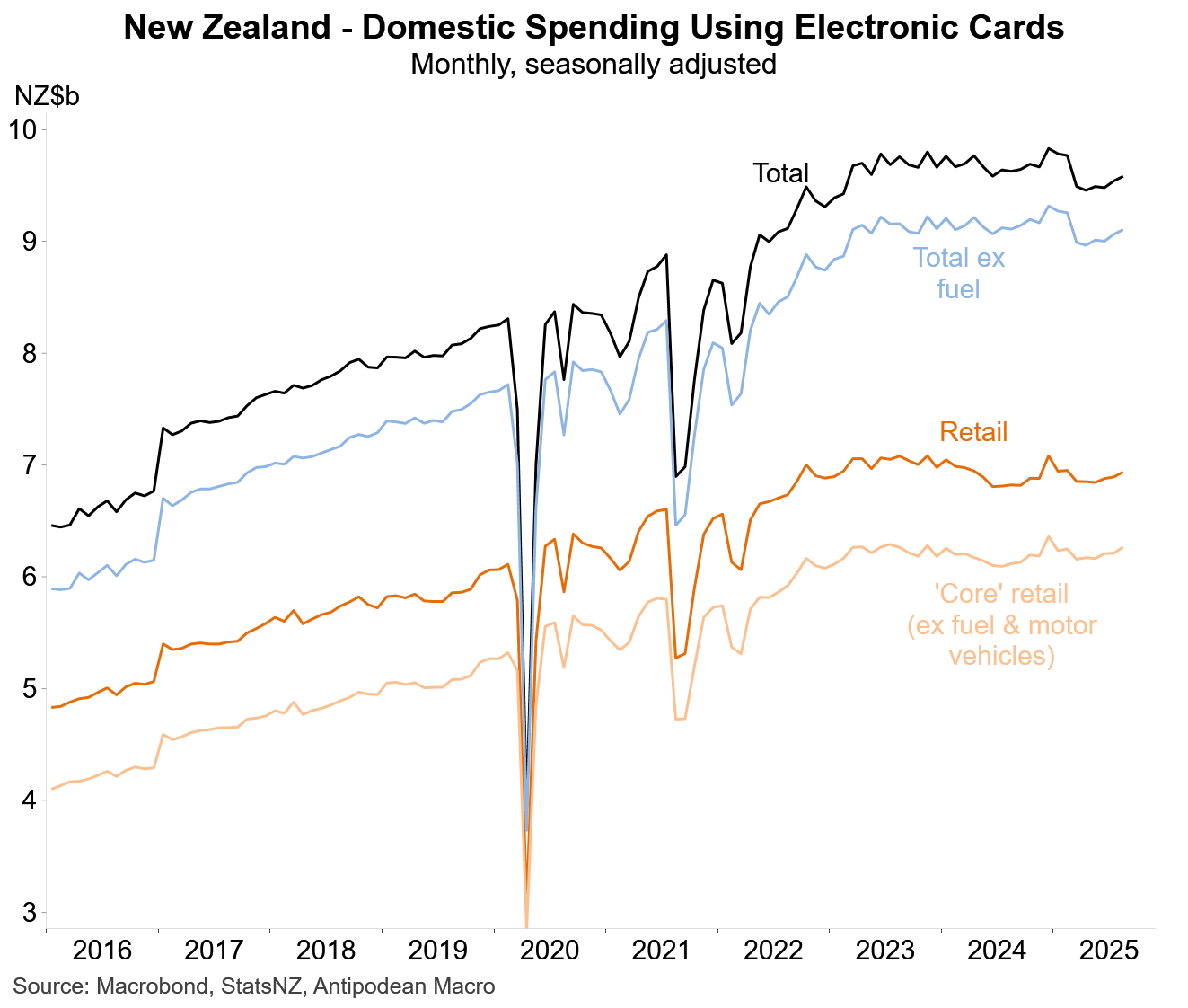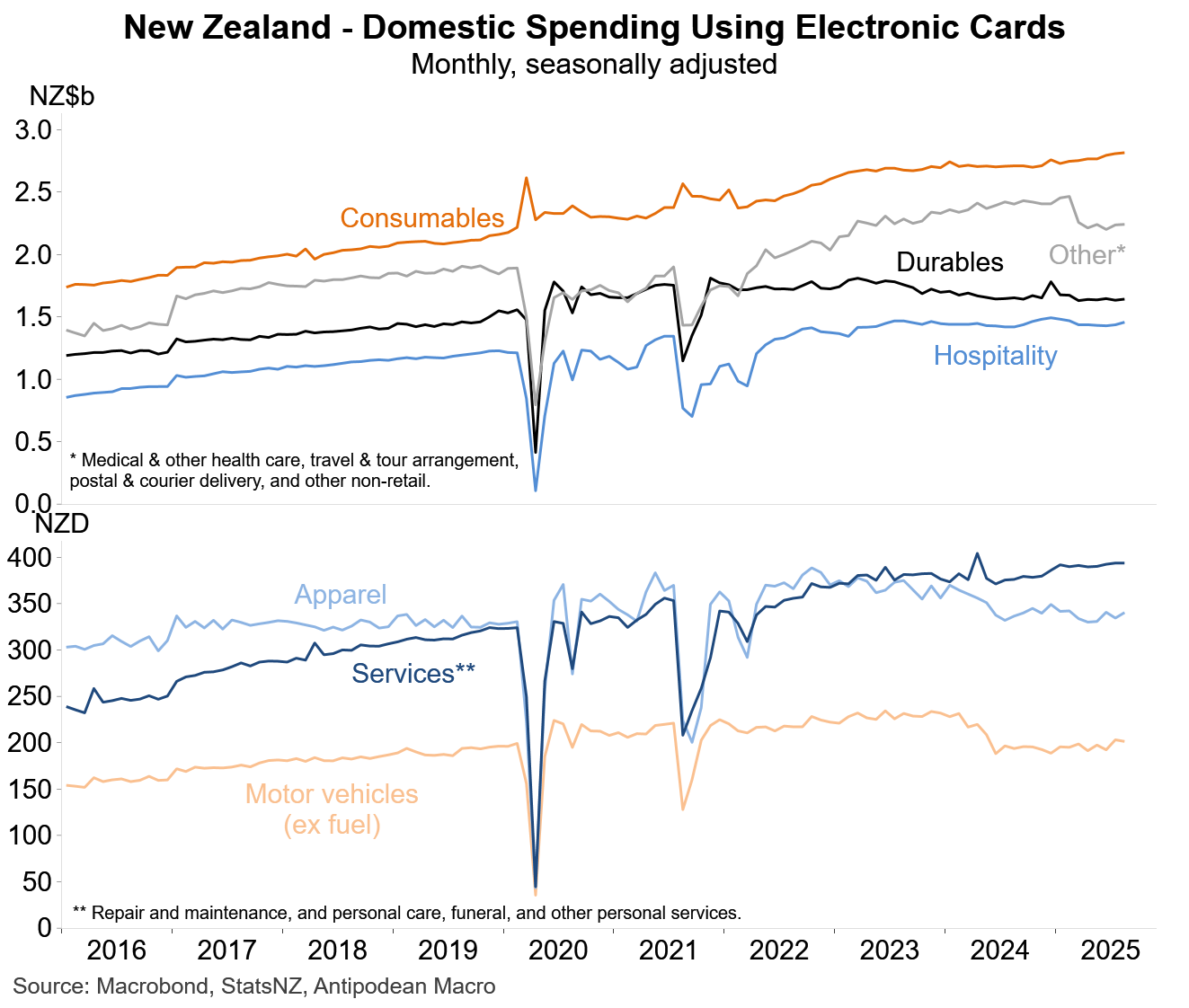 1. Domestic spending using credit and debit cards in New Zealand rose +0.4% m/m in August. Retail spending rose +0.7% m/m and ‘core’ retail spending increased +0.9% m/m.