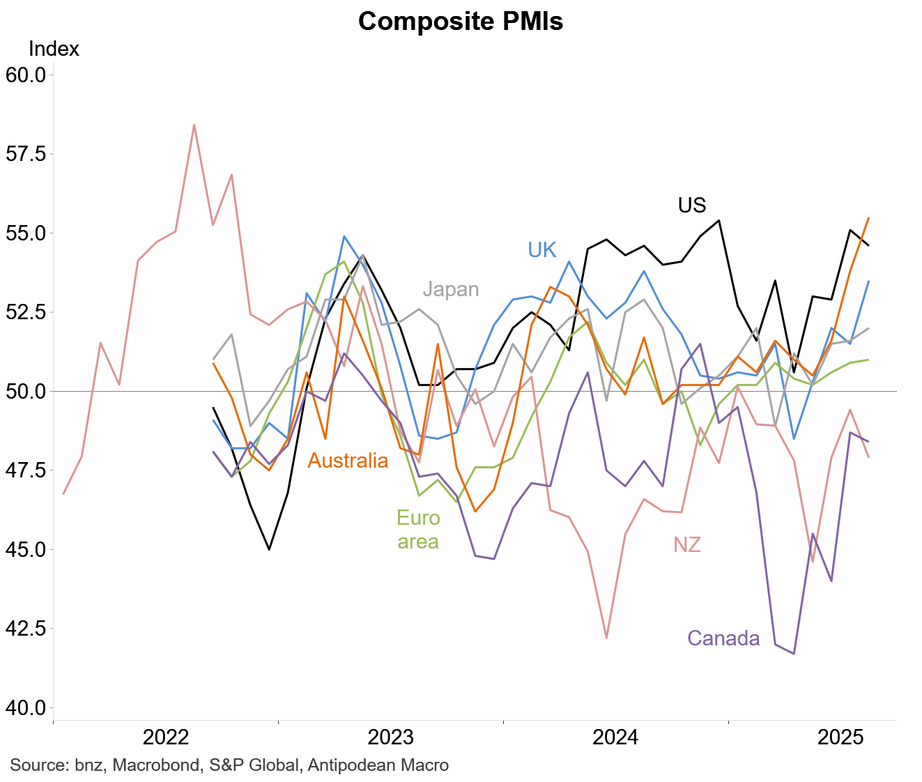 2. The kiwi PMI suggests that GDP growth in New Zealand remains fairly weak, though not as bad as last year.