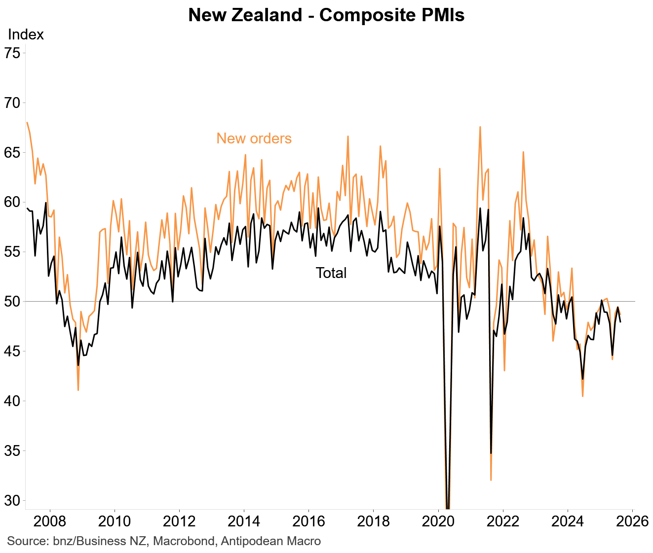 1. New Zealand’s composite PMI - the PCI - fell in August to a still-weak 47.9. The new orders component also pulled back.