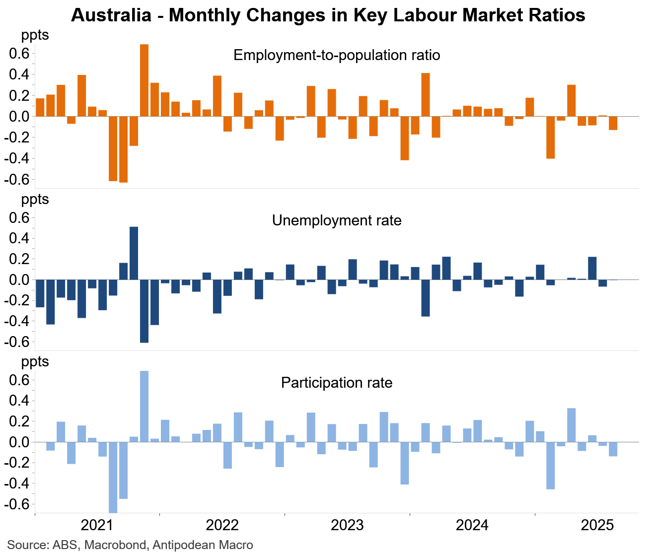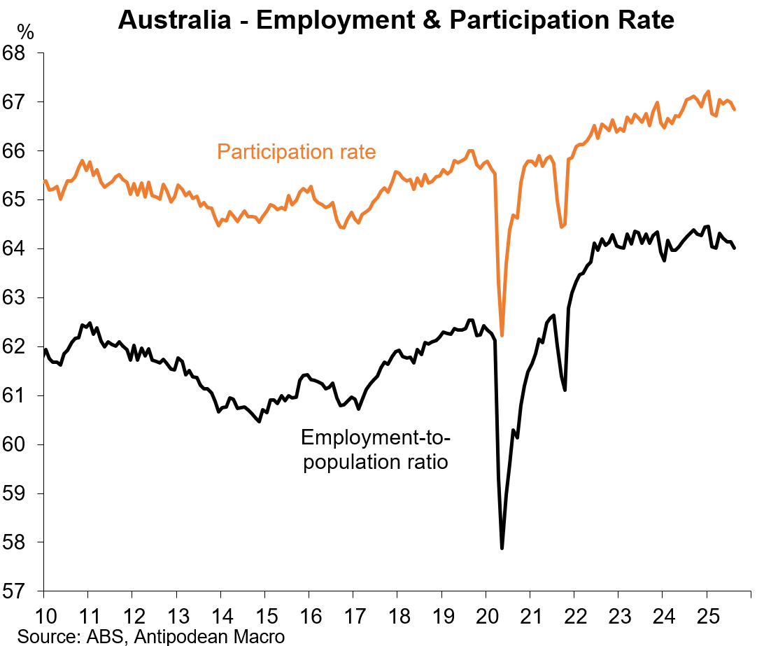 Looking through the noise, labour market conditions have softened this year. The unemployment rate has drifted higher and both the employment-to-population ratio and participation rate have fallen.