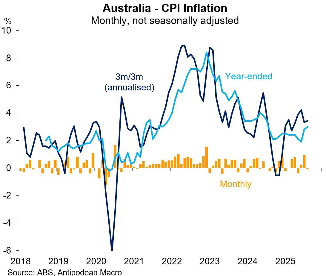 Year-ended CPI inflation rose +0.2ppts to +3.0% y/y. This was bang in line with our expectation but a little above consensus.