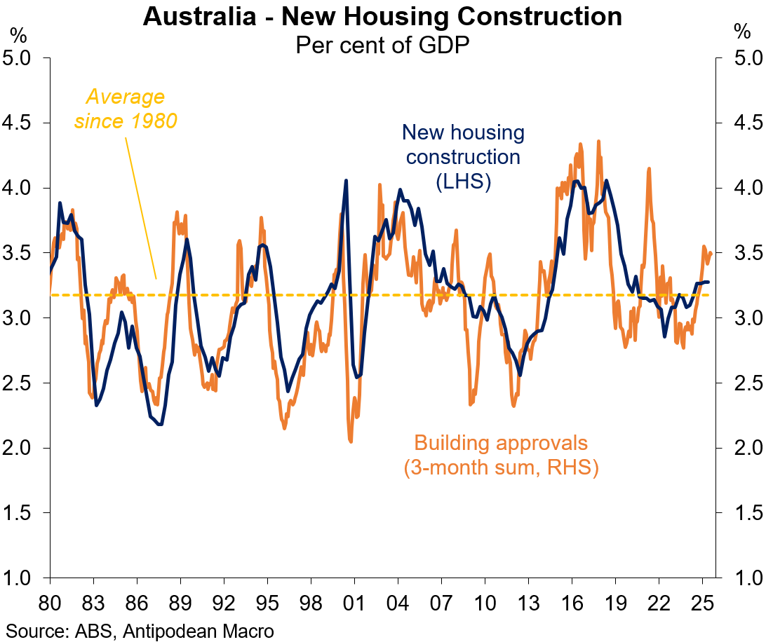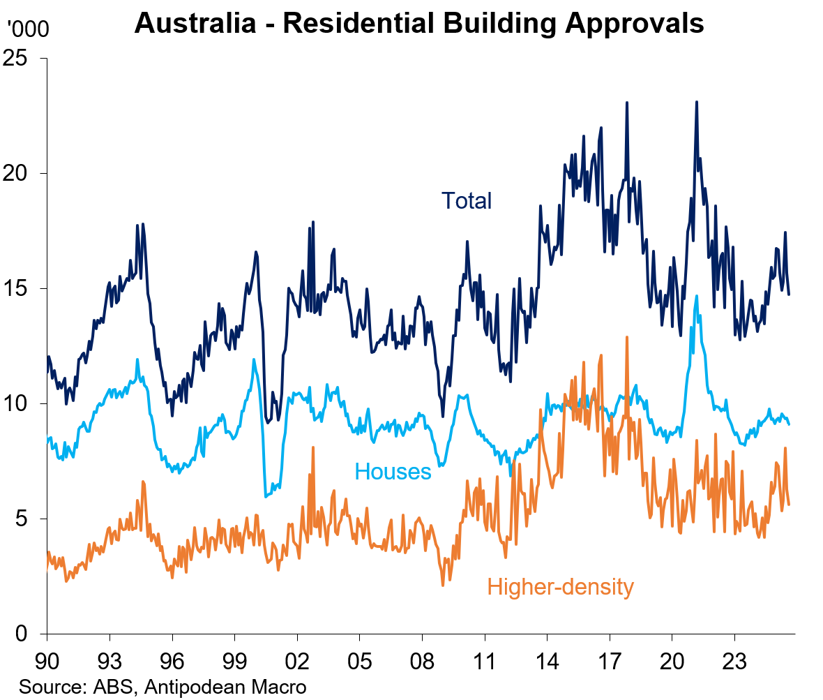 1. The number of dwellings approved in Australia declined 6% m/m in August, led lower by a 10.6% m/m fall in the volatile higher-density component. New house approvals fell 2.9% m/m.