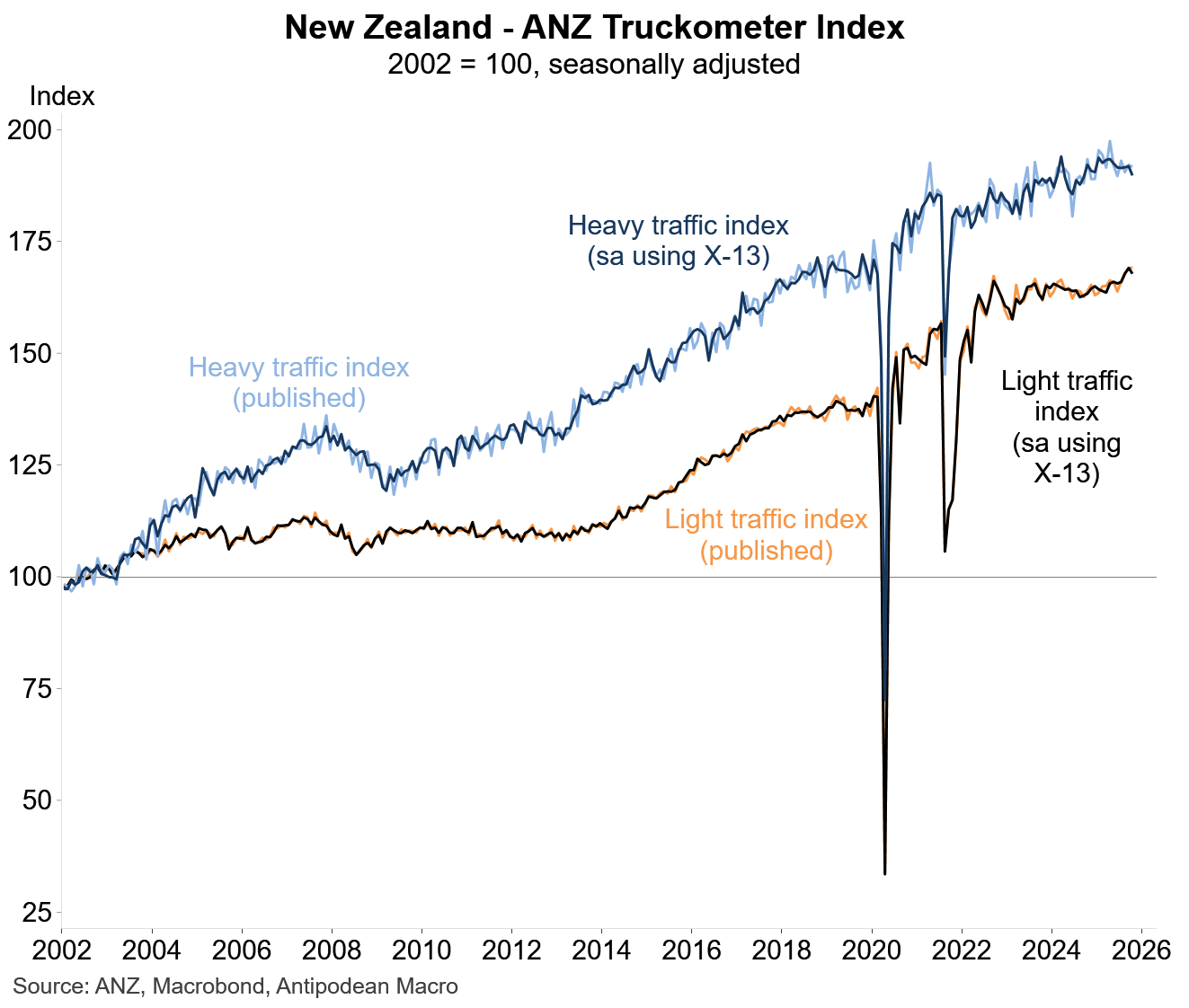 1. ANZ’s Truckometer indices of traffic flows in New Zealand both dipped in October (based on our seasonal adjustment which provides less-volatile series than those published).