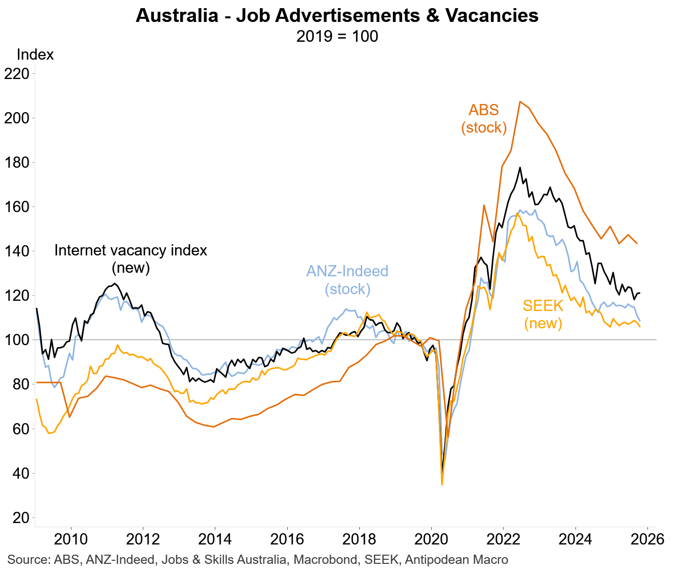 1. The number of new job ads posted on SEEK in Australia fell 1.9% m/m in October following a 0.9% m/m decline in September.