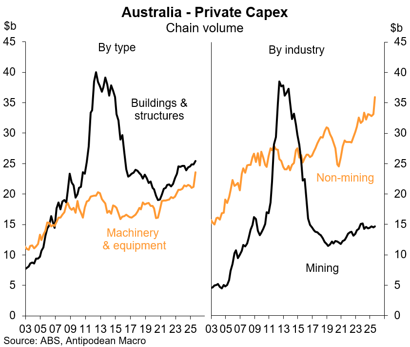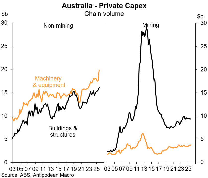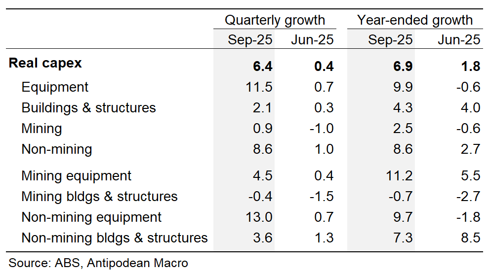 1. Real private capex in Australia rose +6.4% q/q in Q3, with +8.6% q/q growth in non-mining capex and a +0.9% q/q rise in mining capex.