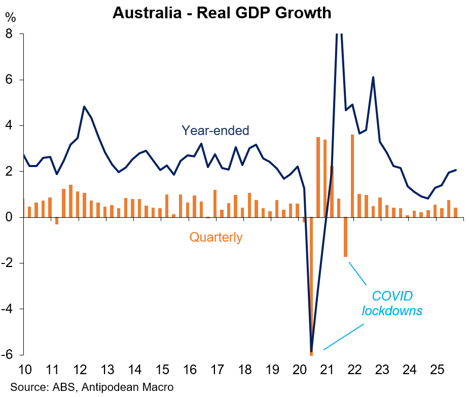Quarterly growth was weaker than the +0.7% q/q we and consensus had pencilled in (though year-ended growth was only 0.1ppts softer than expected).