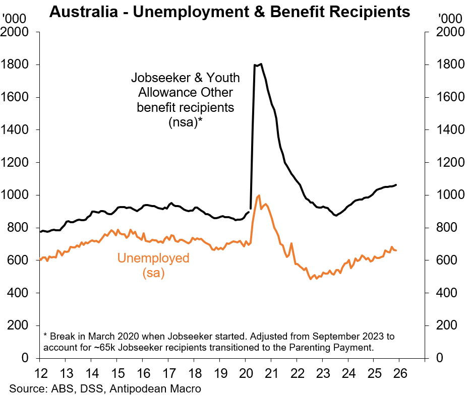 1. The number of Jobseeker benefit recipients in Australia picked up a little in November but this typically lags the official unemployment statistics (including due to wait times and other restrictions to receive benefits).
