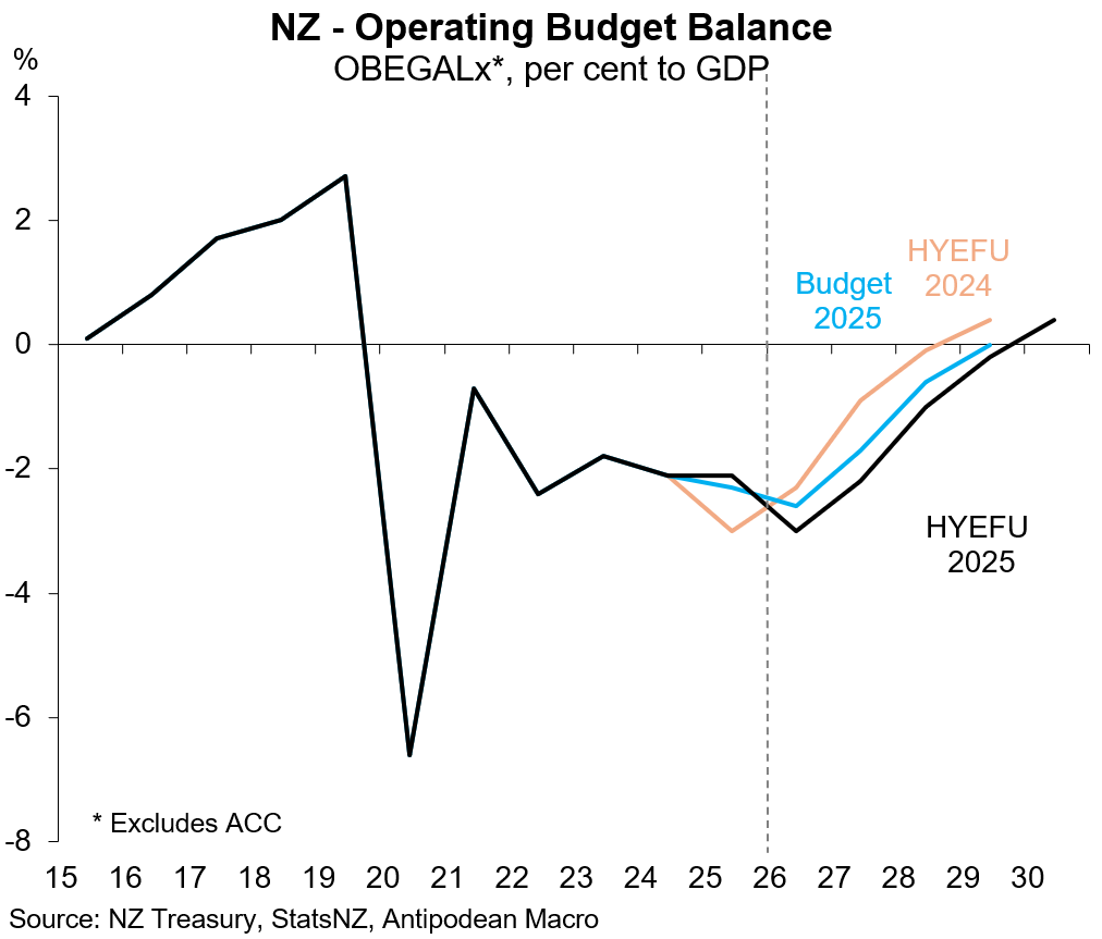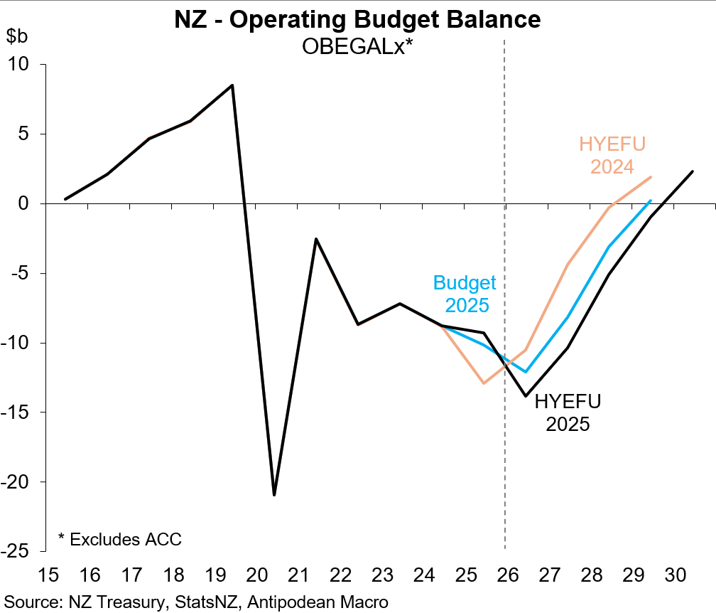 1. New Zealand’s half-year fiscal update (HYEFU) projects larger operating budget deficits over the forecast horizon.