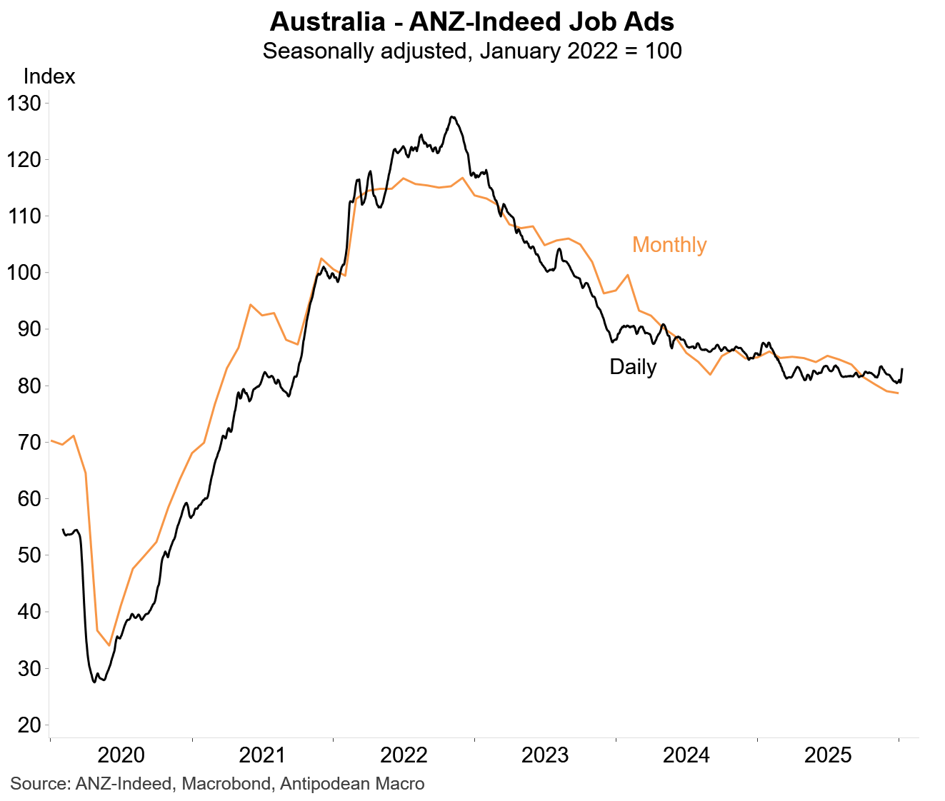 Daily Indeed job ads have been a little more resilient than the monthly ANZ-Indeed series (which also includes job ads from the government Workforce Australia jobs board).