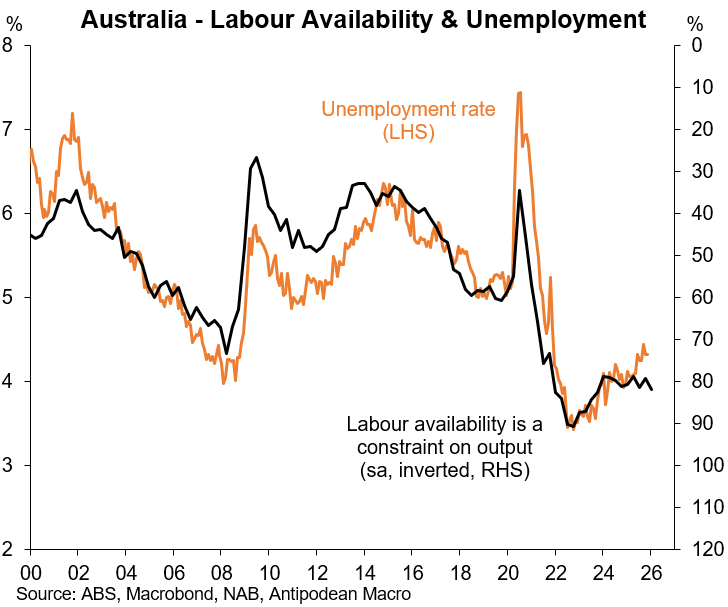 1. The share of Australian firms reporting that labour availability is a constraint on their output rose in Q4 and has fluctuated around a gradual rising trend over the past 12-18 months.