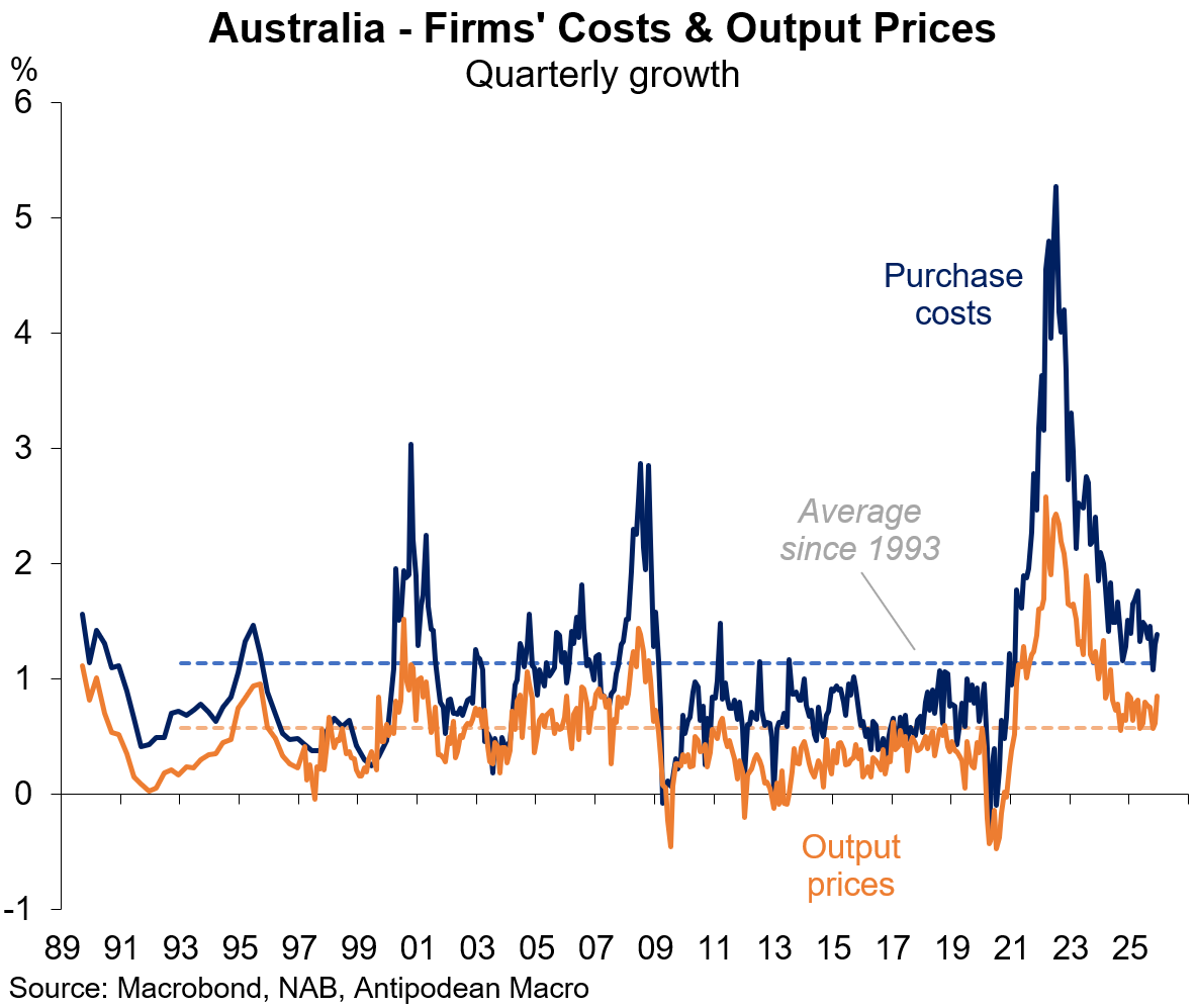 1. Australian firms reported increases in input and output price inflation in December according to the NAB business survey. Both measures were a bit above the averages since 1993 (the inflation targeting period).