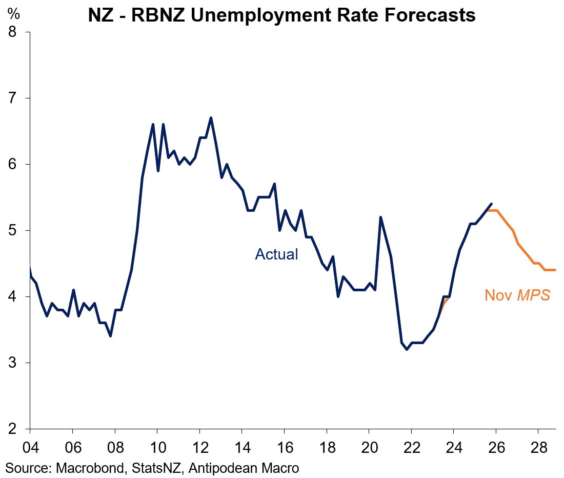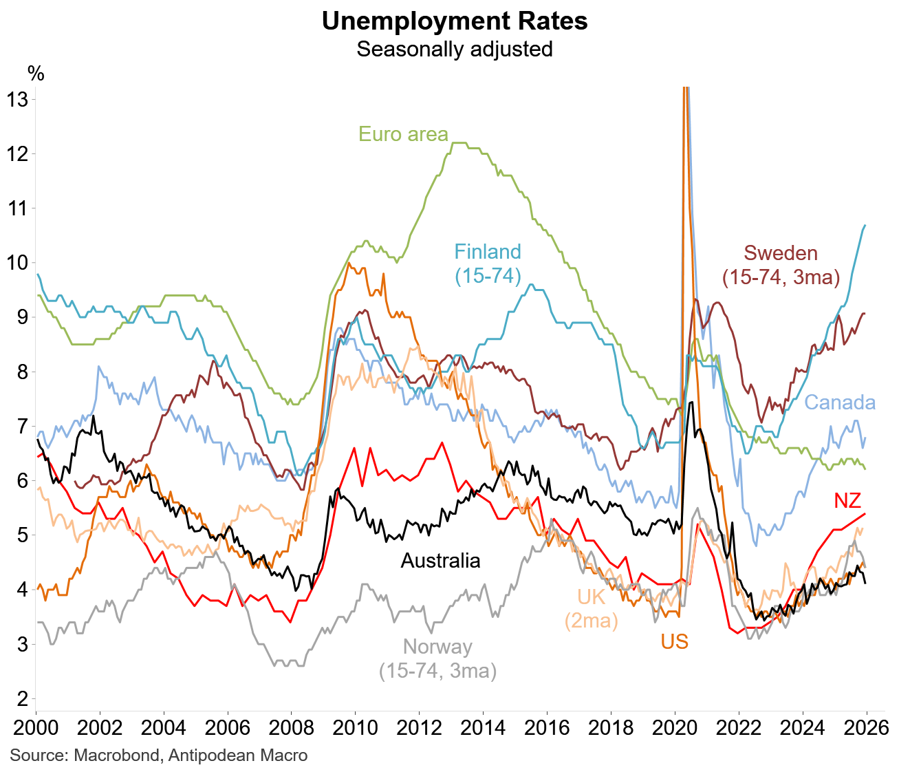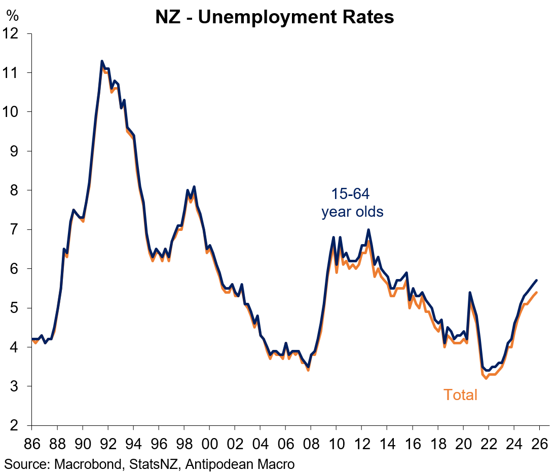1. New Zealand’s unemployment rate rose +0.1ppts to 5.4% in Q4 2025. This was slightly higher than the RBNZ’s November MPS forecast.