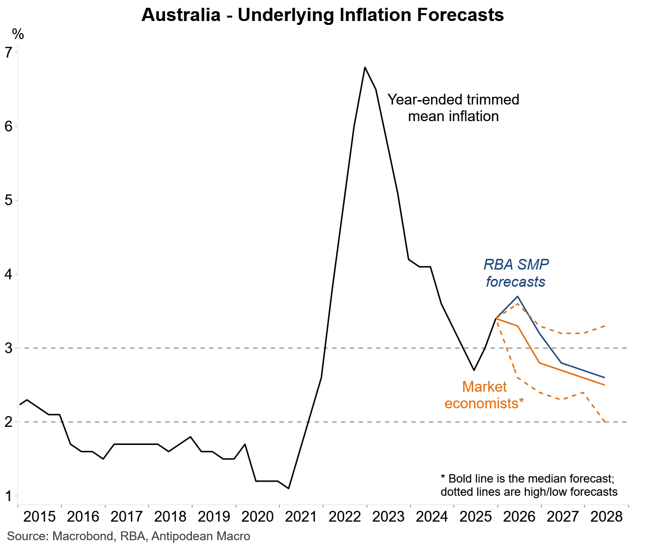 1. Upon the release of the RBA’s updated forecasts we highlighted (here) that the near-term upgrades to the Bank’s trimmed mean inflation outlook now mean there are clearer downside risks to those forecasts.