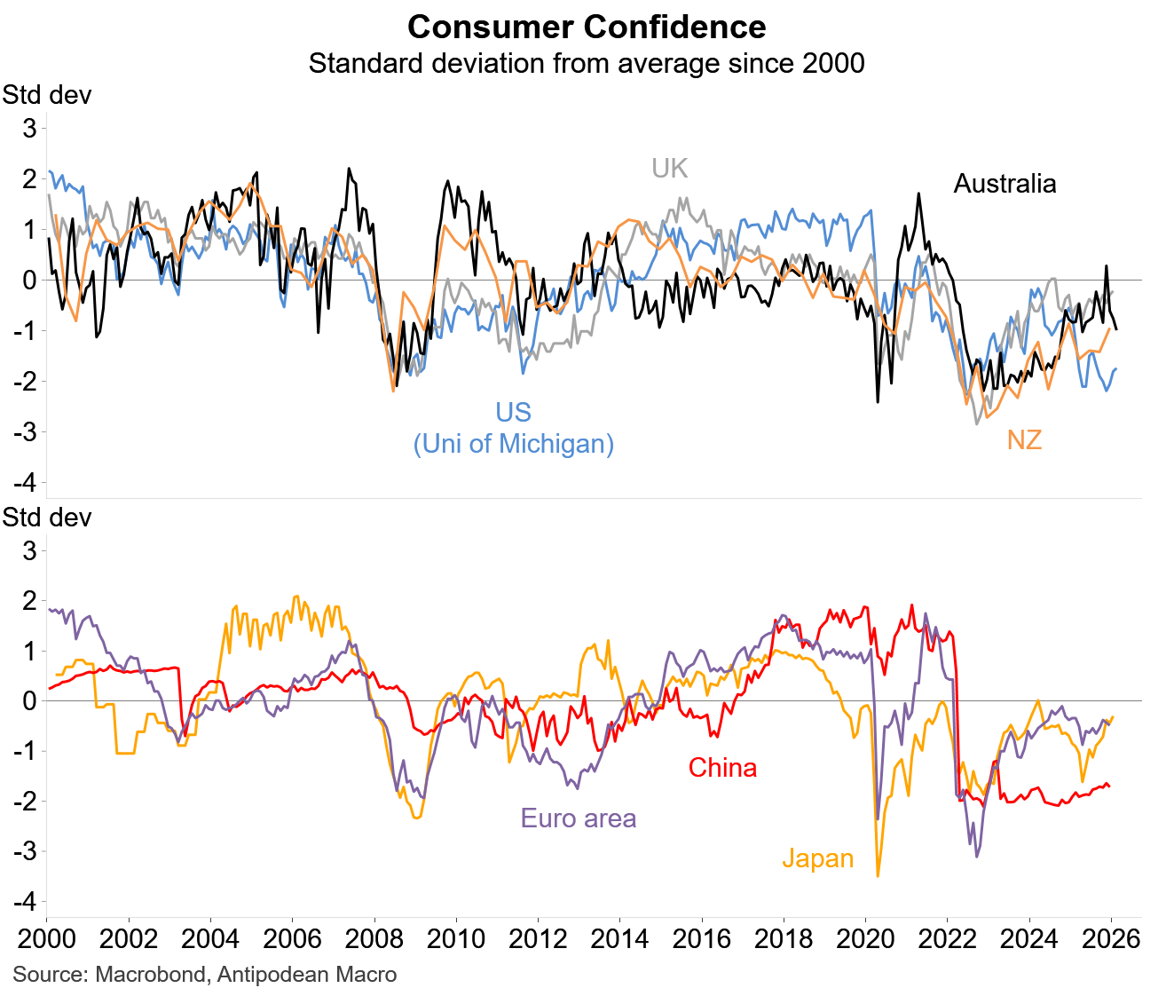Aus consumer sentiment, Aus NAB business survey, NZ activity & Truckometer, NZ mortgage rates , Queensland cigarette spending