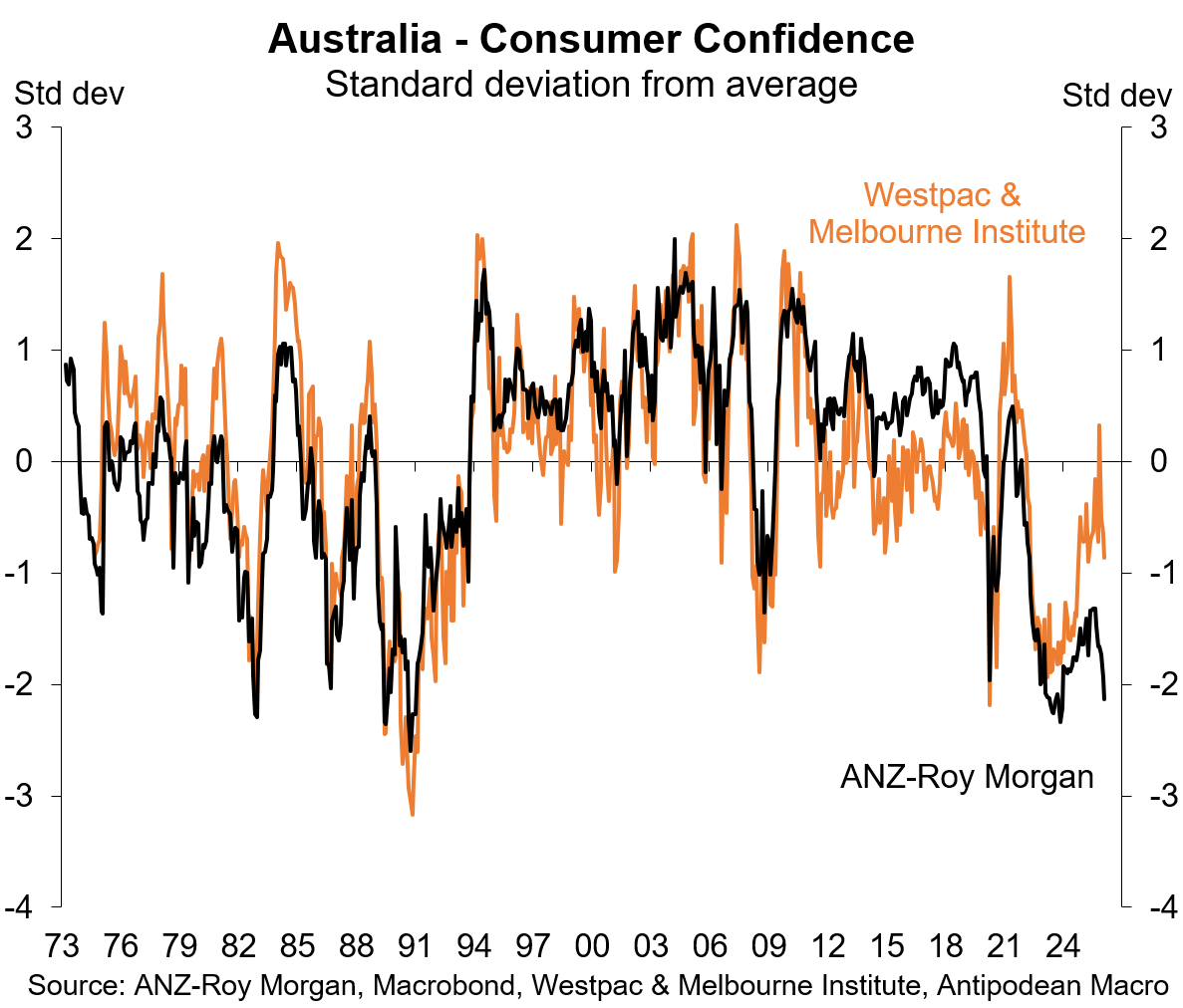 The weekly ANZ-Roy Morgan measure remains much weaker than the monthly WMI series.