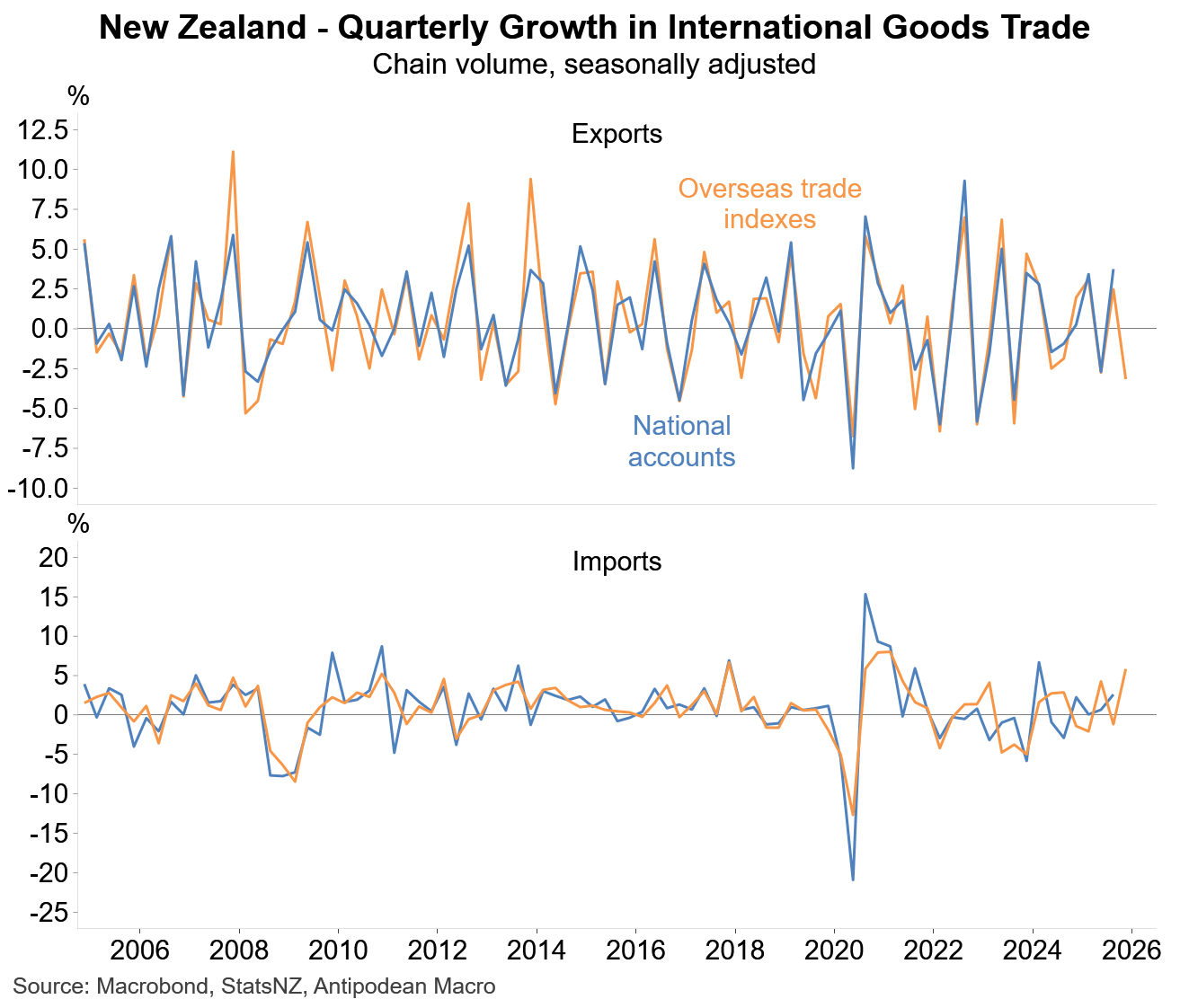 1. Partial data point to a contraction in New Zealand’s goods export volumes in Q4 2025 following strong growth in Q3. Goods import volumes appear to have risen solidly in the quarter.